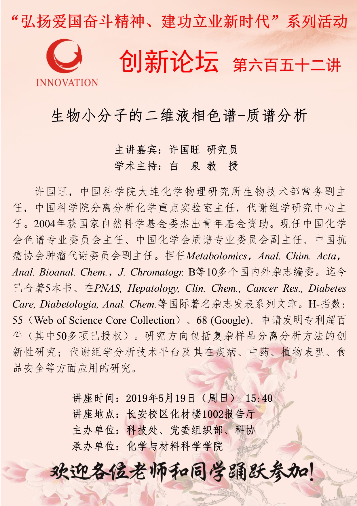 许国旺 赢博官方(中国)总部创新论坛第六百五十二讲(“弘扬爱国奋斗精神、建功立业新时代”系列活动):生物小分子的二维液相色谱-质谱分析 讲座时间 2019年5月19日(周日) 15:40 讲座地点 长安校区化材楼1002报告厅 讲座人介绍 许国旺 讲座内容