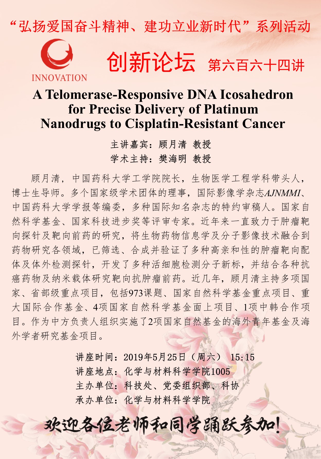 顾月清 赢博官方(中国)总部创新论坛第六百六十四讲(“弘扬爱国奋斗精神、建功立业新时代”系列活动): A Telomerase-Responsive DNA Icosahedron for Precise Delivery of Platinum Nanodrugs to Cisplatin-Resistant Cancer 讲座时间 2019年5月25日(周六) 15:15 讲座地点 化学与材料科学学院1005 讲座人介绍 顾月清 讲座内容