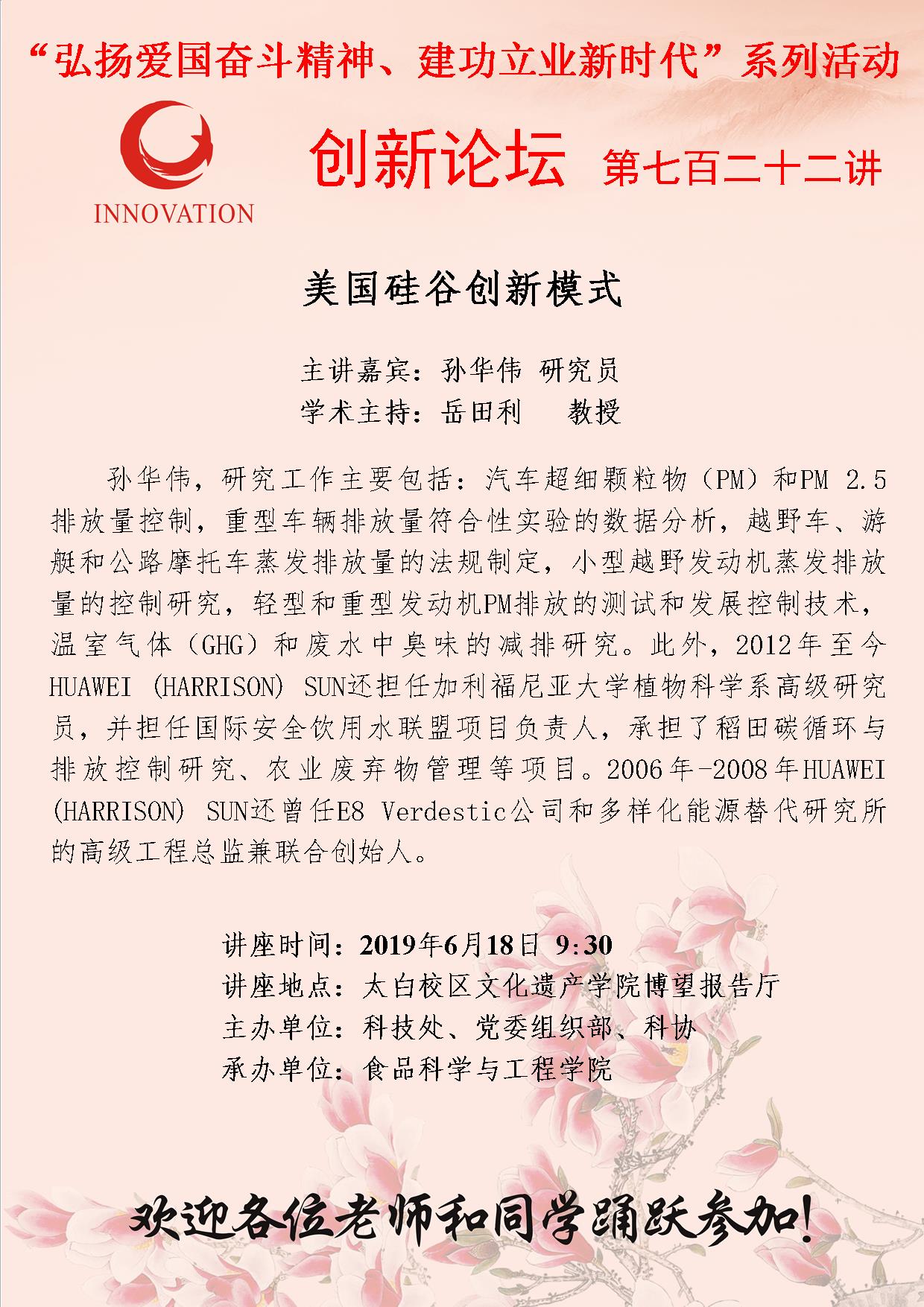 孙华伟 赢博官方(中国)总部创新论坛第七百二十二讲(“弘扬爱国奋斗精神、建功立业新时代”系列活动):美国硅谷创新模式 讲座时间 2019年6月18日 9:30 讲座地点 太白校区文化遗产学院博望报告厅 讲座人介绍 孙华伟 讲座内容