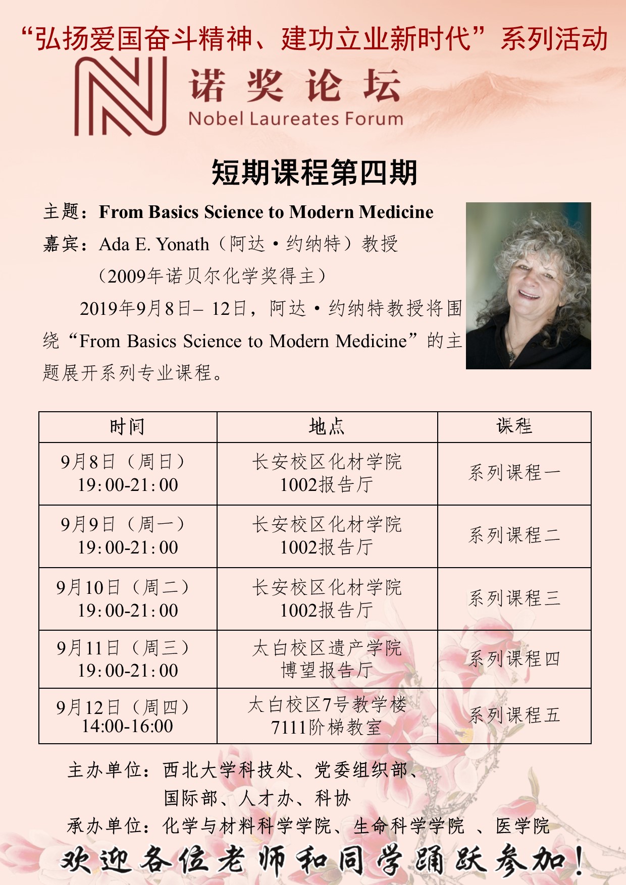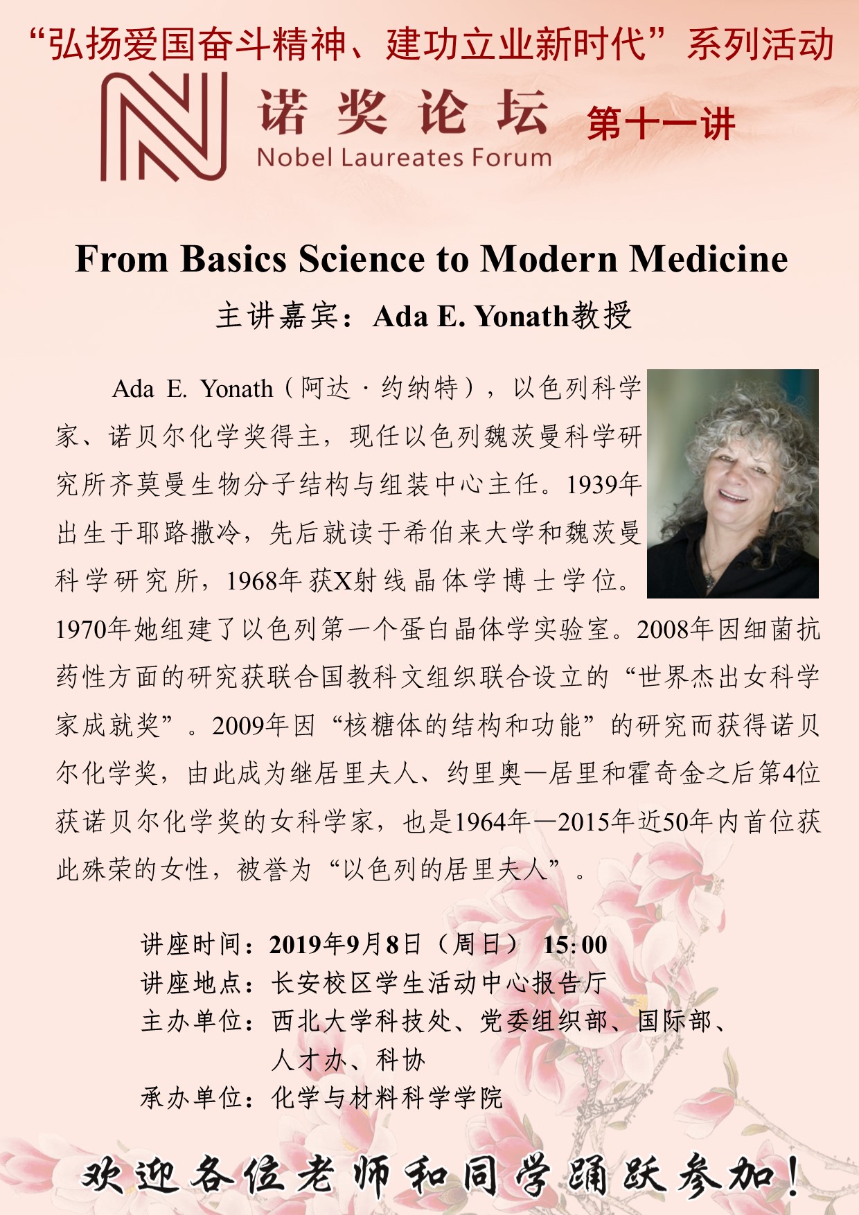 Ada E. Yonath 赢博官方(中国)总部“诺奖论坛”第十一讲(“弘扬爱国奋斗精神、建功立业新时代”系列活动 ):From Basics Science to Modern Medicine 讲座时间 2019年9月8日(周日)15:00 讲座地点 长安校区学生活动中心报告厅 讲座人介绍 Ada E. Yonath 讲座内容