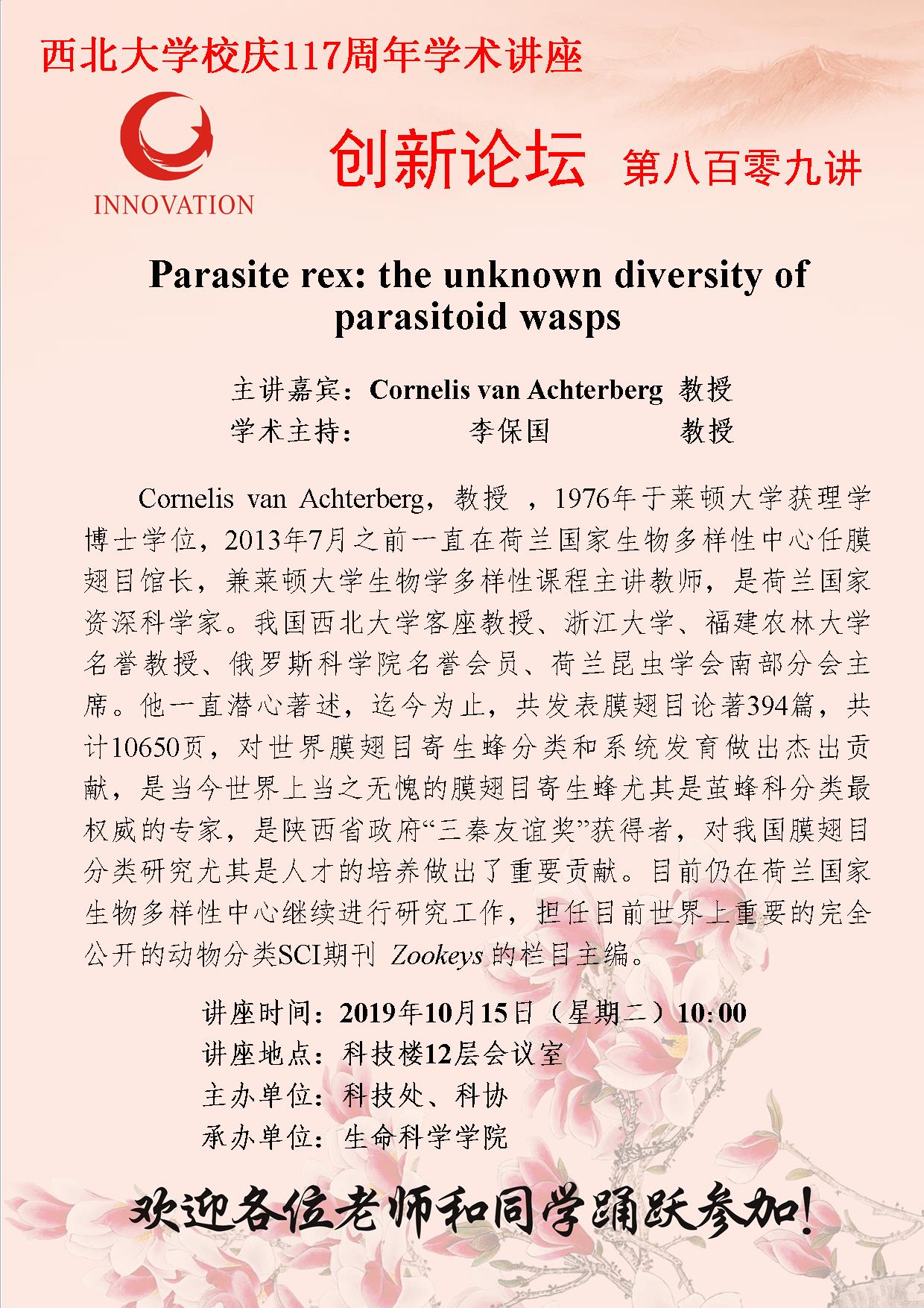 Cornelis van Achterberg 赢博官方(中国)总部创新论坛第八百零九讲暨校庆117周年学术讲座:Parasite rex: the unknown diversity of parasitoid wasps 讲座时间 2019年10月15日(星期二)10:00 讲座地点 科技楼12层会议室 讲座人介绍 Cornelis van Achterberg 讲座内容