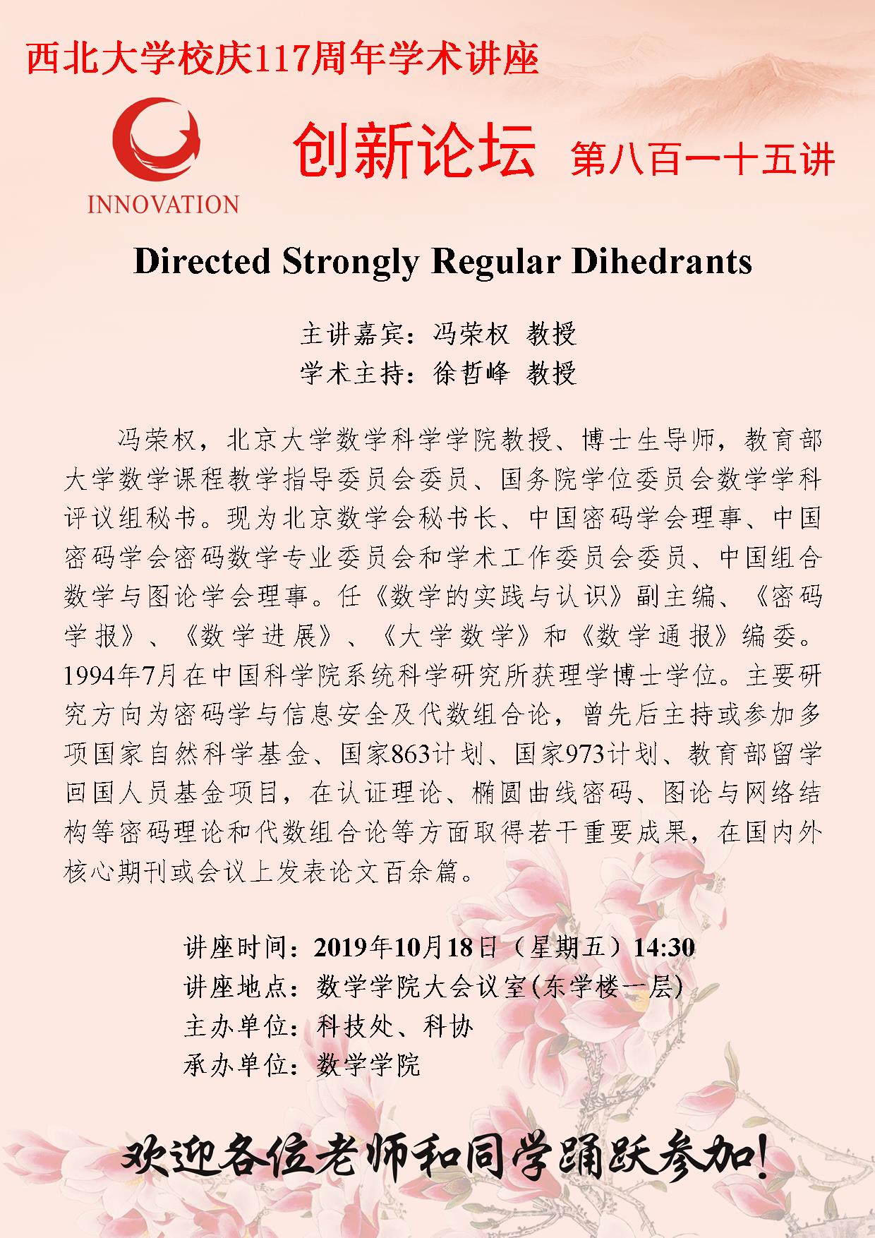 冯荣权 赢博官方(中国)总部创新论坛第八百一十五讲暨校庆117周年学术讲座:Directed Strongly Regular Dihedrants 讲座时间 2019年10月18日(星期五)14:30 讲座地点 东学楼一层大会议室 讲座人介绍 冯荣权 讲座内容