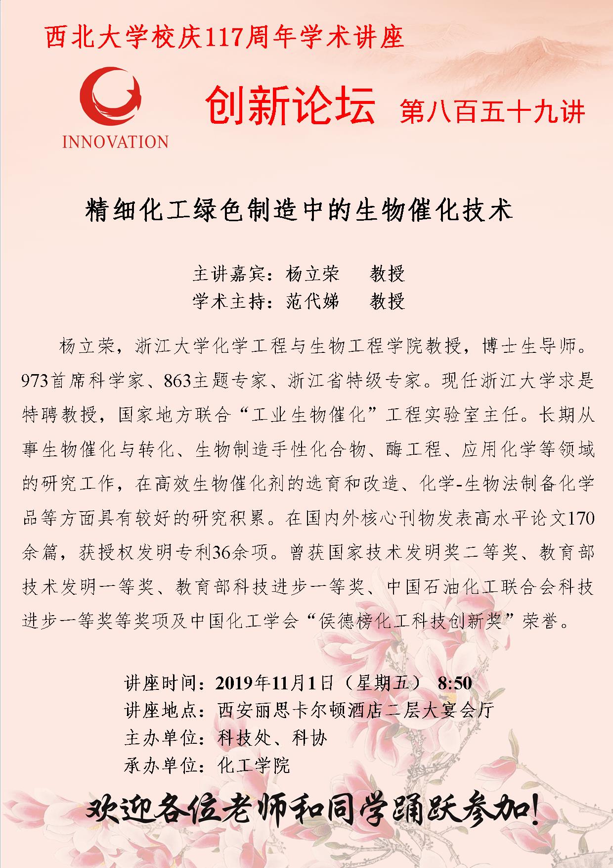 杨立荣 赢博官方(中国)总部创新论坛第八百五十九讲暨校庆117周年学术讲座:精细化工绿色制造中的生物催化技术 讲座时间 2019年11月1日(星期五) 8:50 讲座地点 西安丽思卡尔顿酒店二层大宴会厅 讲座人介绍 杨立荣 讲座内容