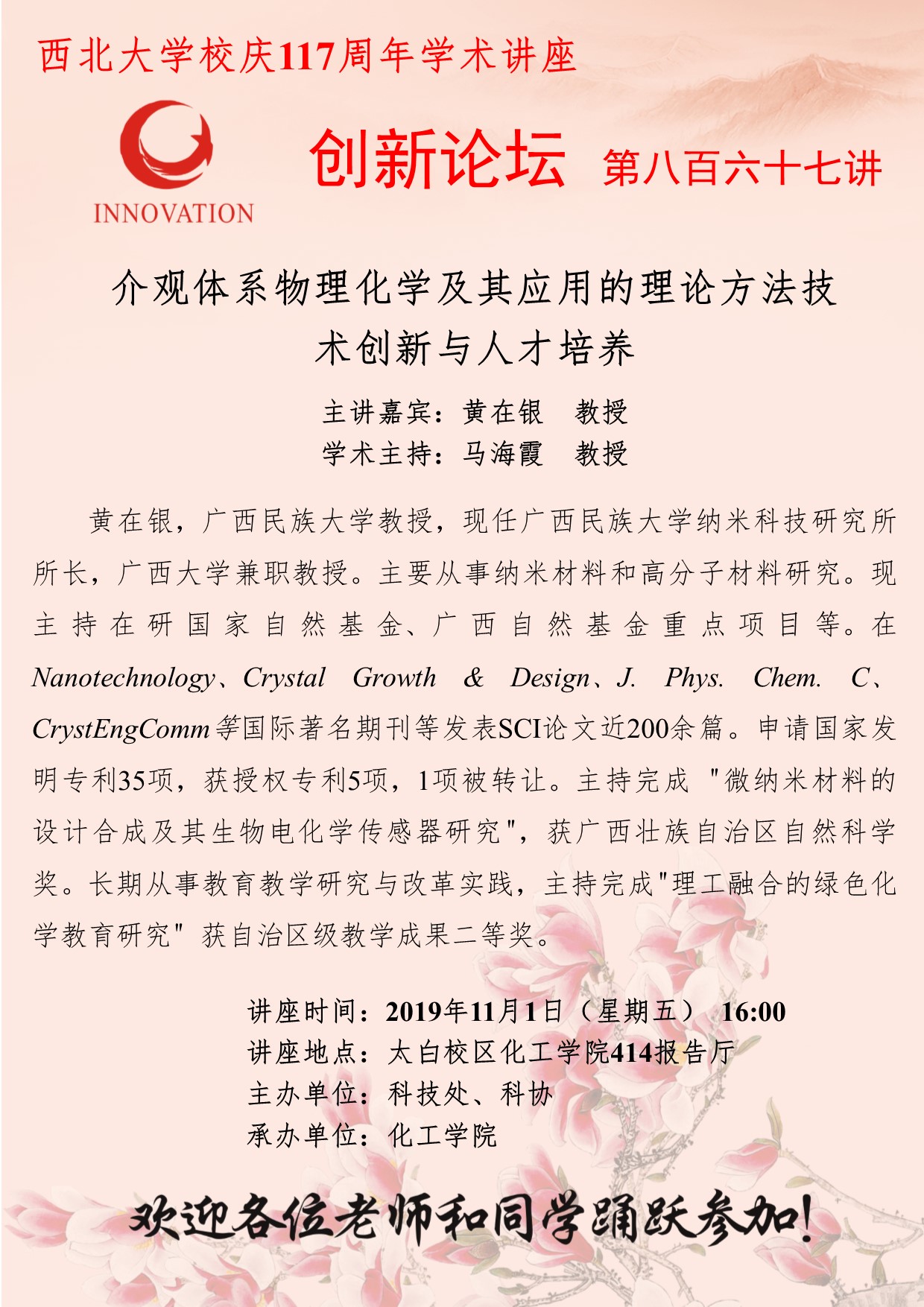 黄在银 赢博官方(中国)总部创新论坛第八百六十七讲暨校庆117周年学术讲座:介观体系物理化学及其应用的理论方法技术创新与人才培养 讲座时间 2019年11月1日(星期五) 16:00 讲座地点 太白校区化工学院414报告厅 讲座人介绍 黄在银 讲座内容