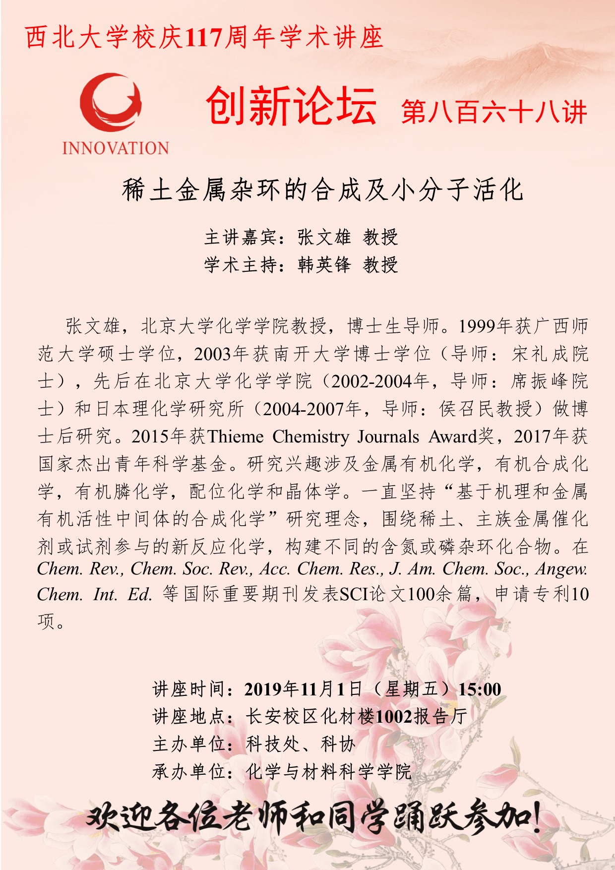 张文雄 赢博官方(中国)总部创新论坛第八百六十八讲暨校庆117周年学术讲座:稀土金属杂环的合成及小分子活化 讲座时间 2019年11月1日(星期五)15:00 讲座地点 长安校区化材楼1002报告厅 讲座人介绍 张文雄 讲座内容