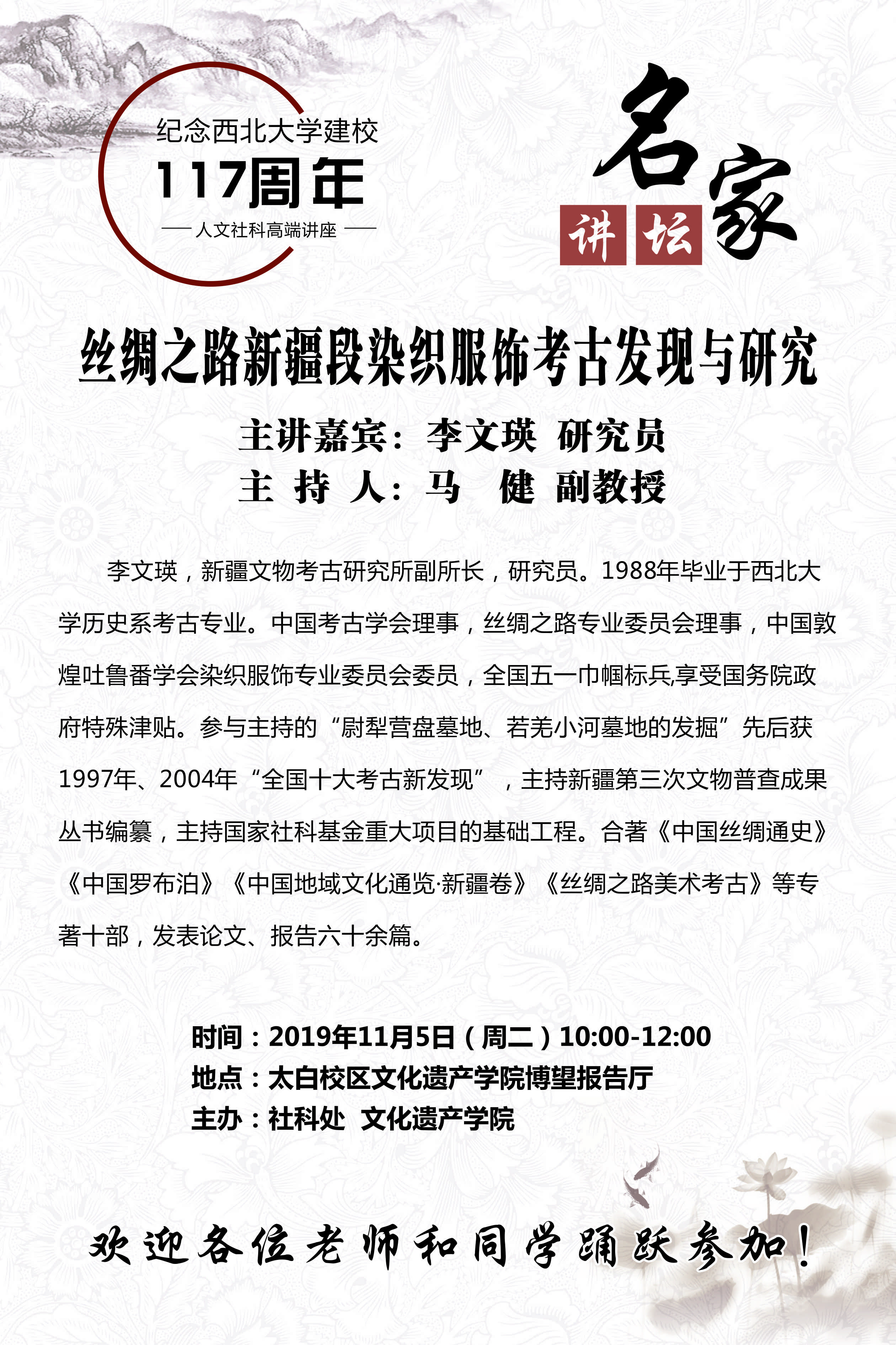 李文瑛 研究员 赢博官方(中国)总部校庆117周年人文社科高端讲座暨“名家讲坛”:丝绸之路新疆段染织服饰考古发现与研究 讲座时间 2019年11月5日(周二)10:00-12:00 讲座地点 太白校区文化遗产学院博望报告厅 讲座人介绍 李文瑛 研究员 讲座内容