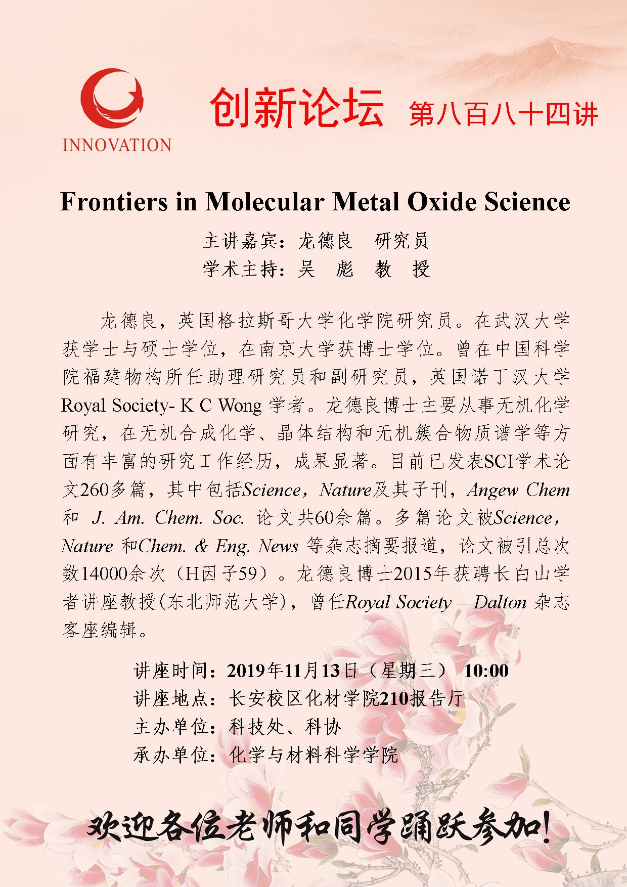 龙德良 赢博官方(中国)总部创新论坛第八百八十四讲:Frontiers in Molecular Metal Oxide Science 讲座时间 2019年11月13日(星期三) 10:00 讲座地点 长安校区化材学院210报告厅 讲座人介绍 龙德良 讲座内容