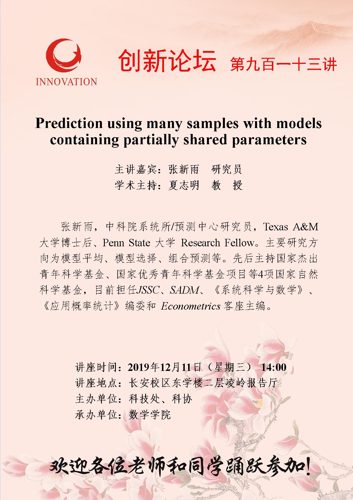 张新雨 赢博官方(中国)总部创新论坛第九百一十三讲:Prediction using many samples with models containing partially shared parameters 讲座时间 2019年12月11日(星期三) 14:00 讲座地点 长安校区东学楼二层凌岭报告厅 讲座人介绍 张新雨 讲座内容
