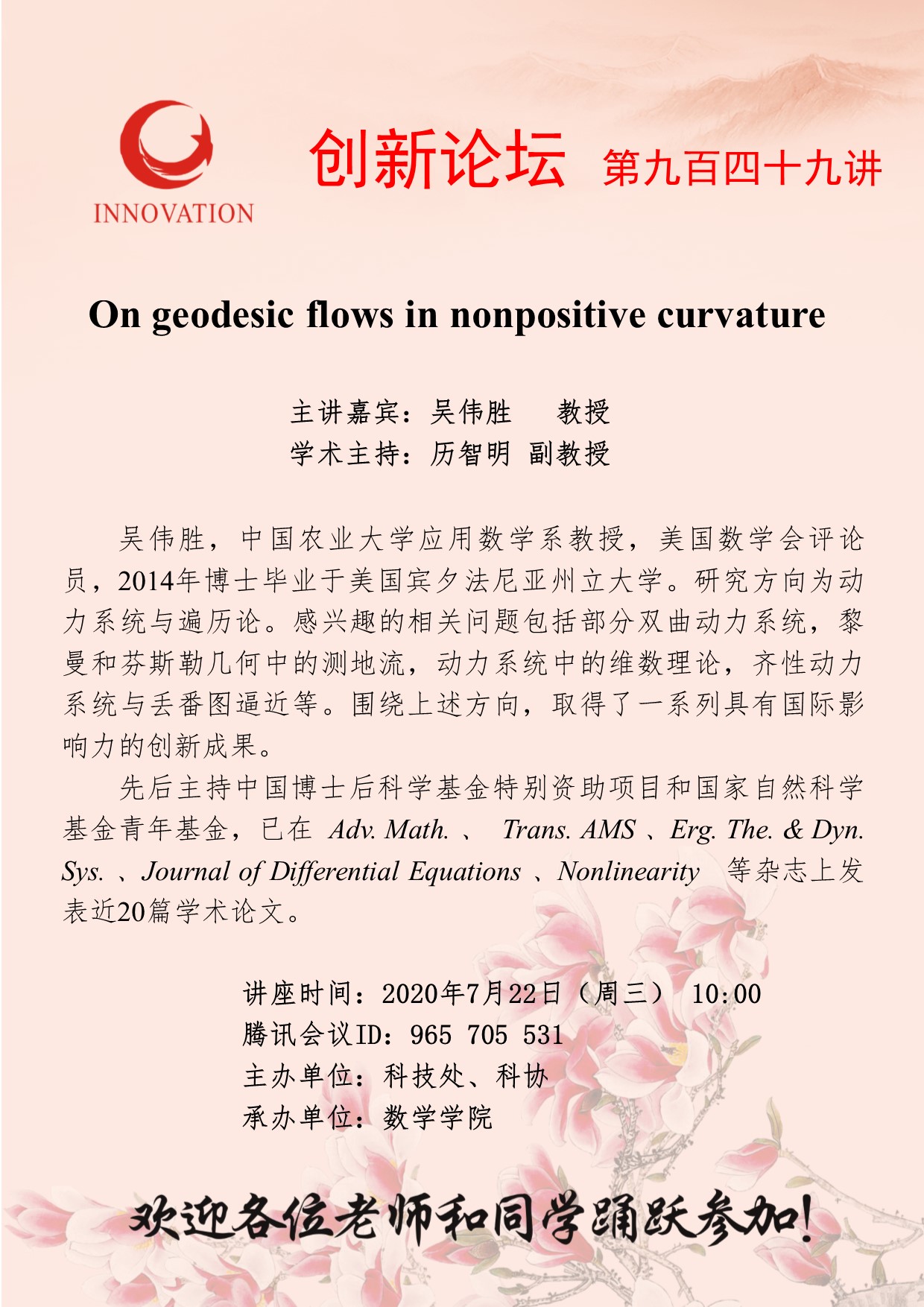 吴伟胜 教授 赢博官方(中国)总部创新论坛第九百四十九讲:On geodesic flows in nonpositive curvature 讲座时间 讲座时间:2020年7月22日(周三) 10:00 讲座地点 腾讯会议ID:965 705 531 讲座人介绍 吴伟胜 教授 讲座内容