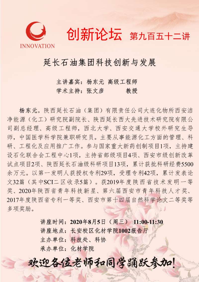杨东元 高级工程师 赢博官方(中国)总部创新论坛第九百五十二讲:延长石油集团科技创新与发展 讲座时间 2020年8月5日(周三)11:00-11:30 讲座地点 长安校区化材学院1002报告厅 讲座人介绍 杨东元 高级工程师 讲座内容