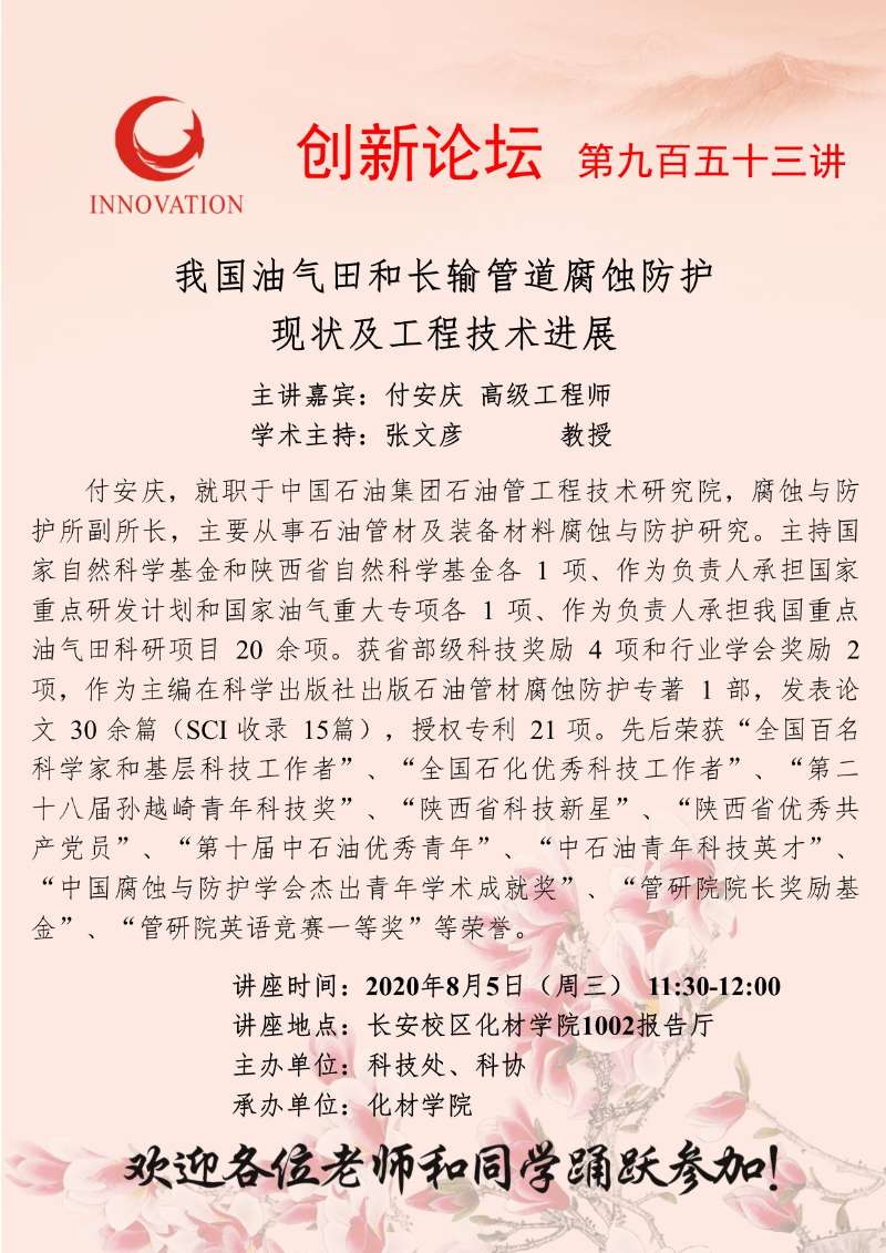 付安庆 高级工程师 赢博官方(中国)总部创新论坛第九百五十三讲:我国油气田和长输管道腐蚀防护现状及工程技术进展 讲座时间 2020年8月5日(周三)11:30-12:00 讲座地点 长安校区化材学院1002报告厅 讲座人介绍 付安庆 高级工程师 讲座内容