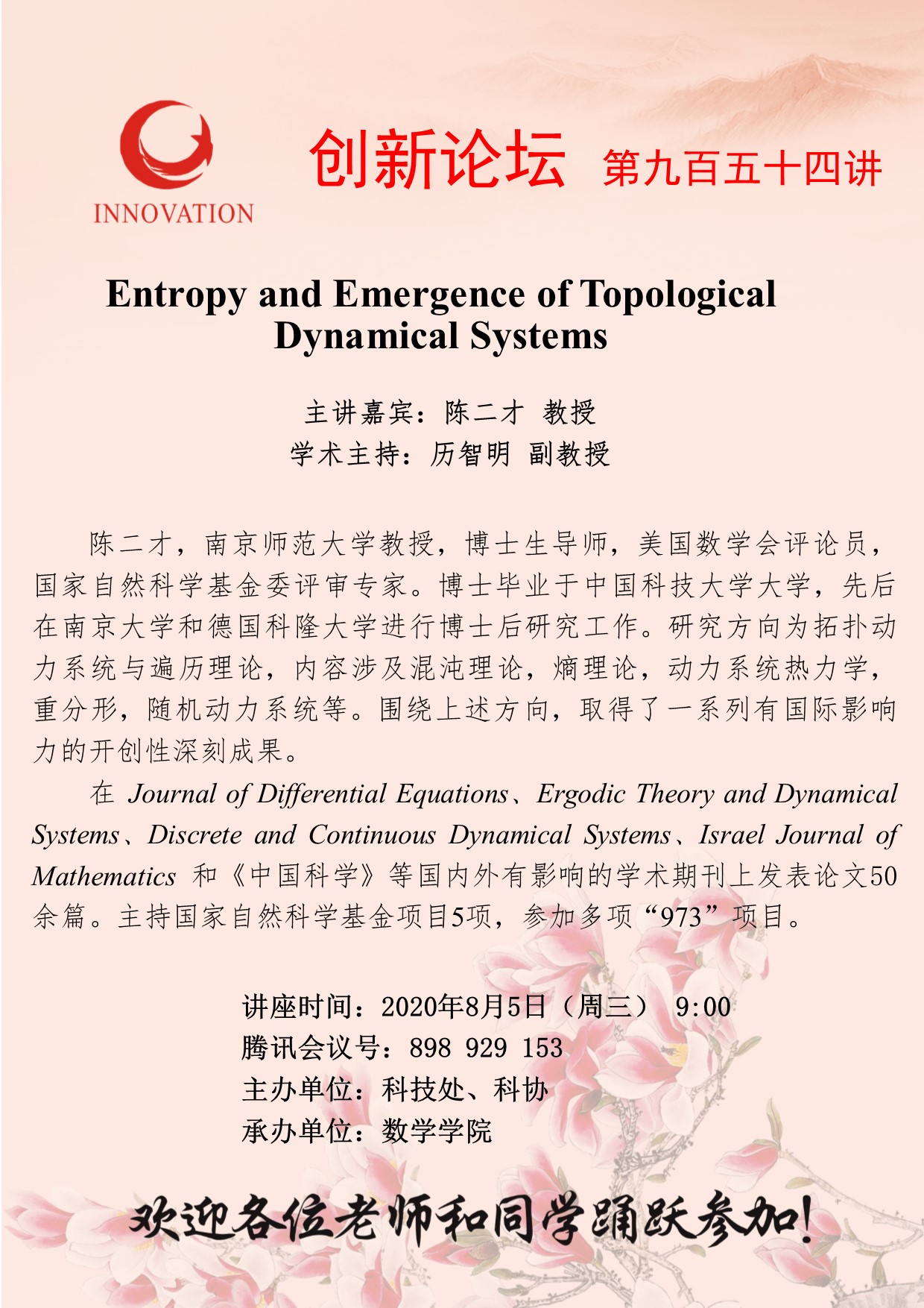 陈二才 教授 赢博官方(中国)总部创新论坛第九百五十四讲: Entropy and Emergency of topological Dynamical Systems 讲座时间 2020年8月5日(周三)9:00 讲座地点 腾讯会议ID:898929153 讲座人介绍 陈二才 教授 讲座内容
