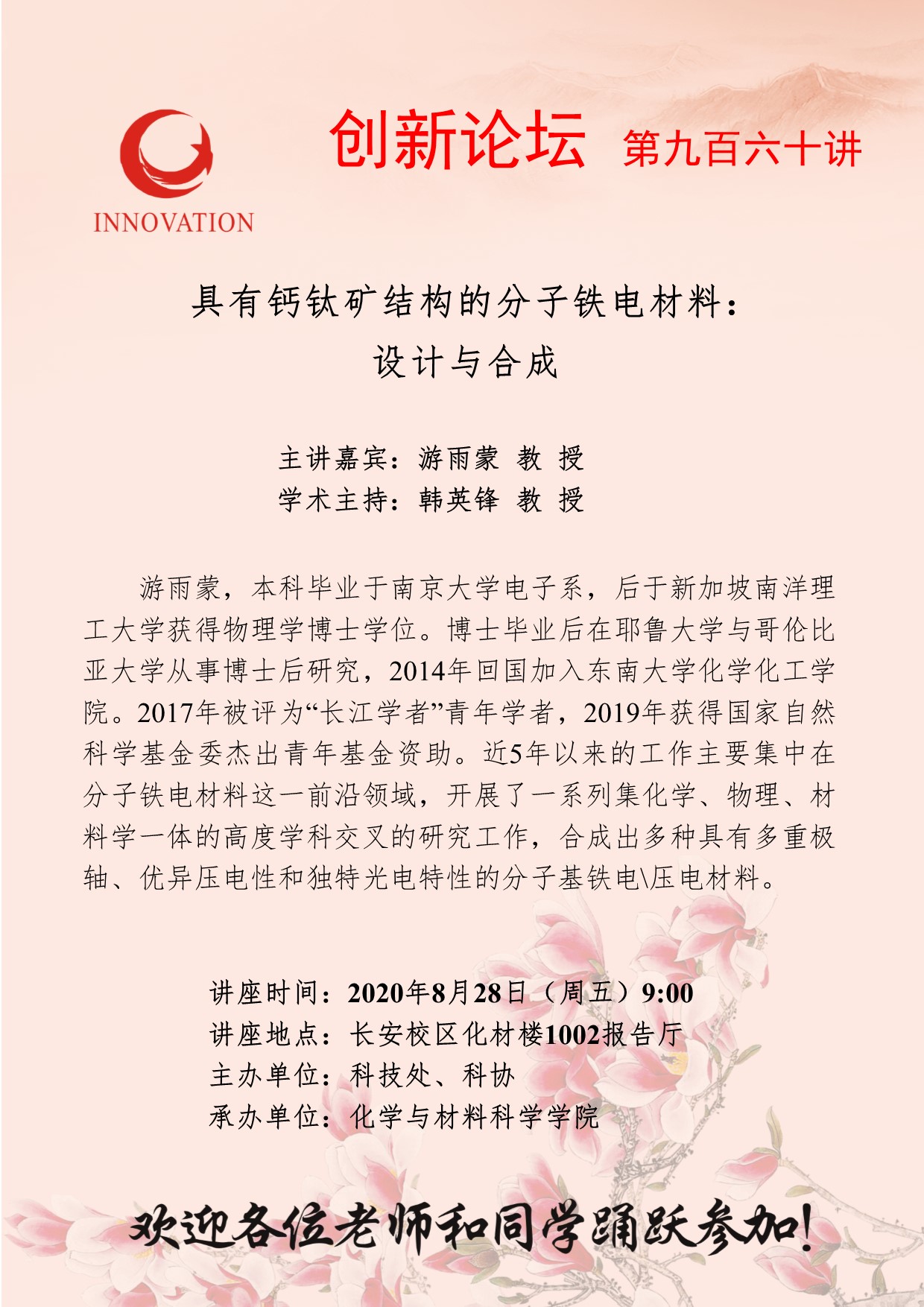 游雨蒙 教授 赢博官方(中国)总部创新论坛第九百六十讲:具有钙钛矿结构的分子铁电材料:设计与合成 讲座时间 2020年8月28日(星期五)9:00 讲座地点 化材学院1002学术报告厅 讲座人介绍 游雨蒙 教授 讲座内容