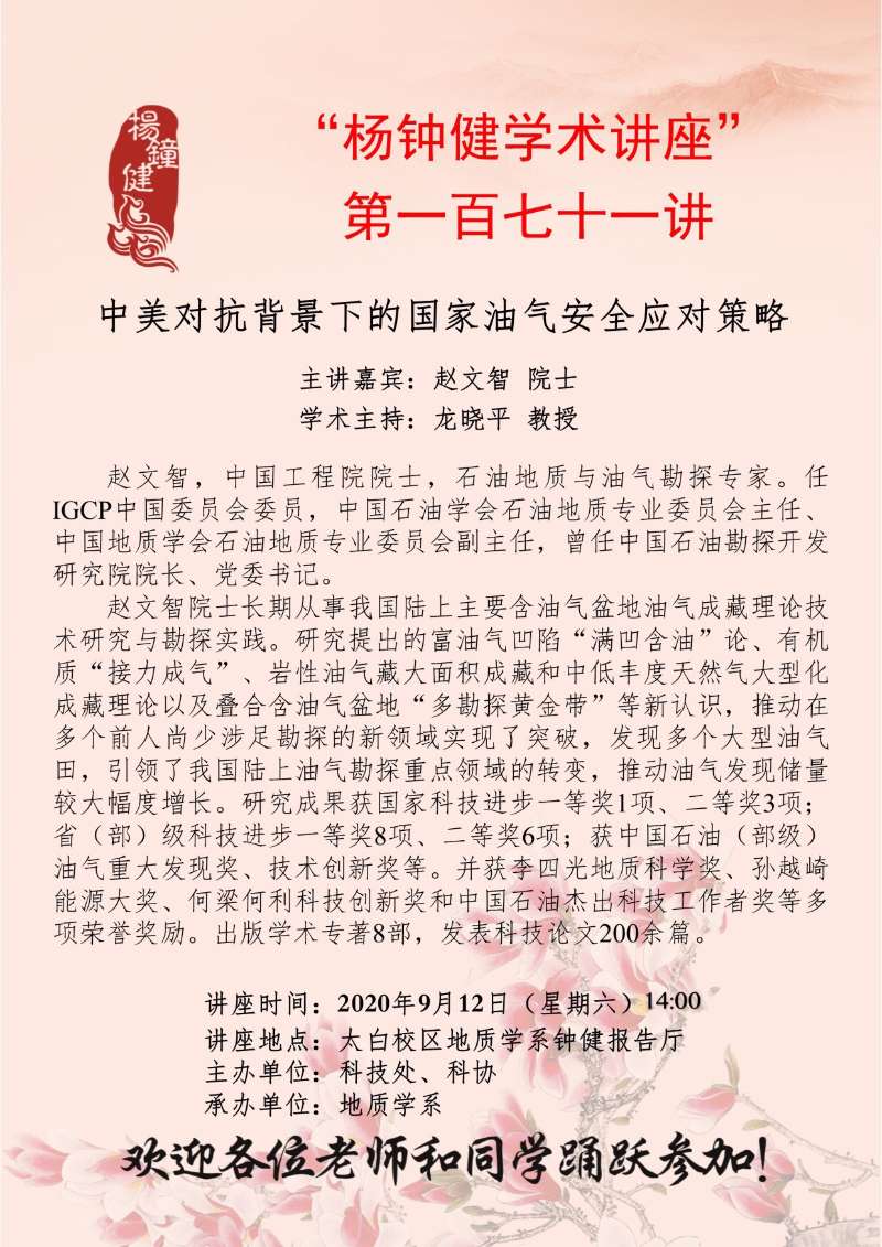 赵文智 院士 “杨钟健学术讲座”第一百七十一讲:中美对抗背景下的国家油气安全应对策略 讲座时间 2020年9月12日(星期六)14:00 讲座地点 太白校区地质学系钟键报告厅 讲座人介绍 赵文智 院士 讲座内容
