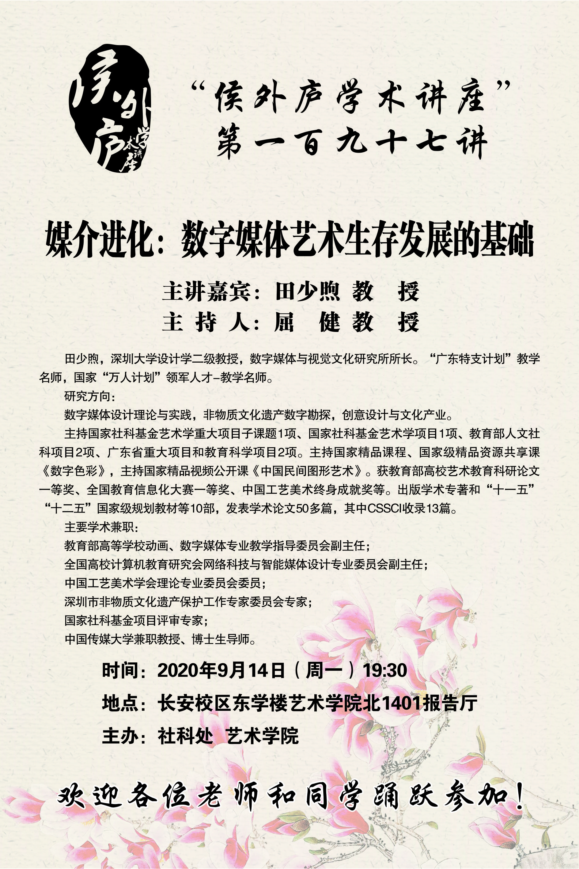 田少煦 教授 侯外庐学术讲座第一百九十七讲:媒介进化:数字媒体艺术生存发展的基础 讲座时间 2020年9月14日(周一)19:30 讲座地点 长安校区东学楼艺术学院北1401报告厅 讲座人介绍 田少煦 教授 讲座内容