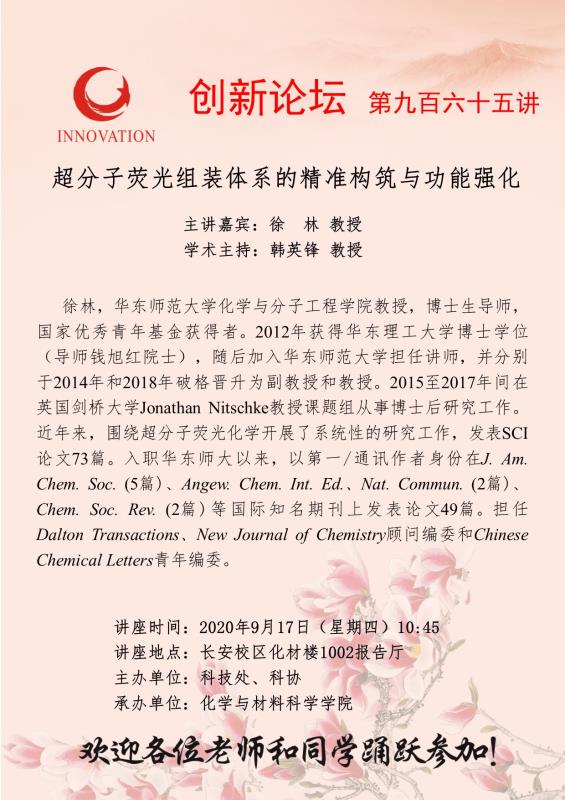 徐林 教授 赢博官方(中国)总部创新论坛第九百六十五讲:超分子荧光组装体系的精准构筑与功能强化 讲座时间 2020年9月17日(星期四)10:45 讲座地点 长安校区化材楼1002报告厅 讲座人介绍 徐林 教授 讲座内容