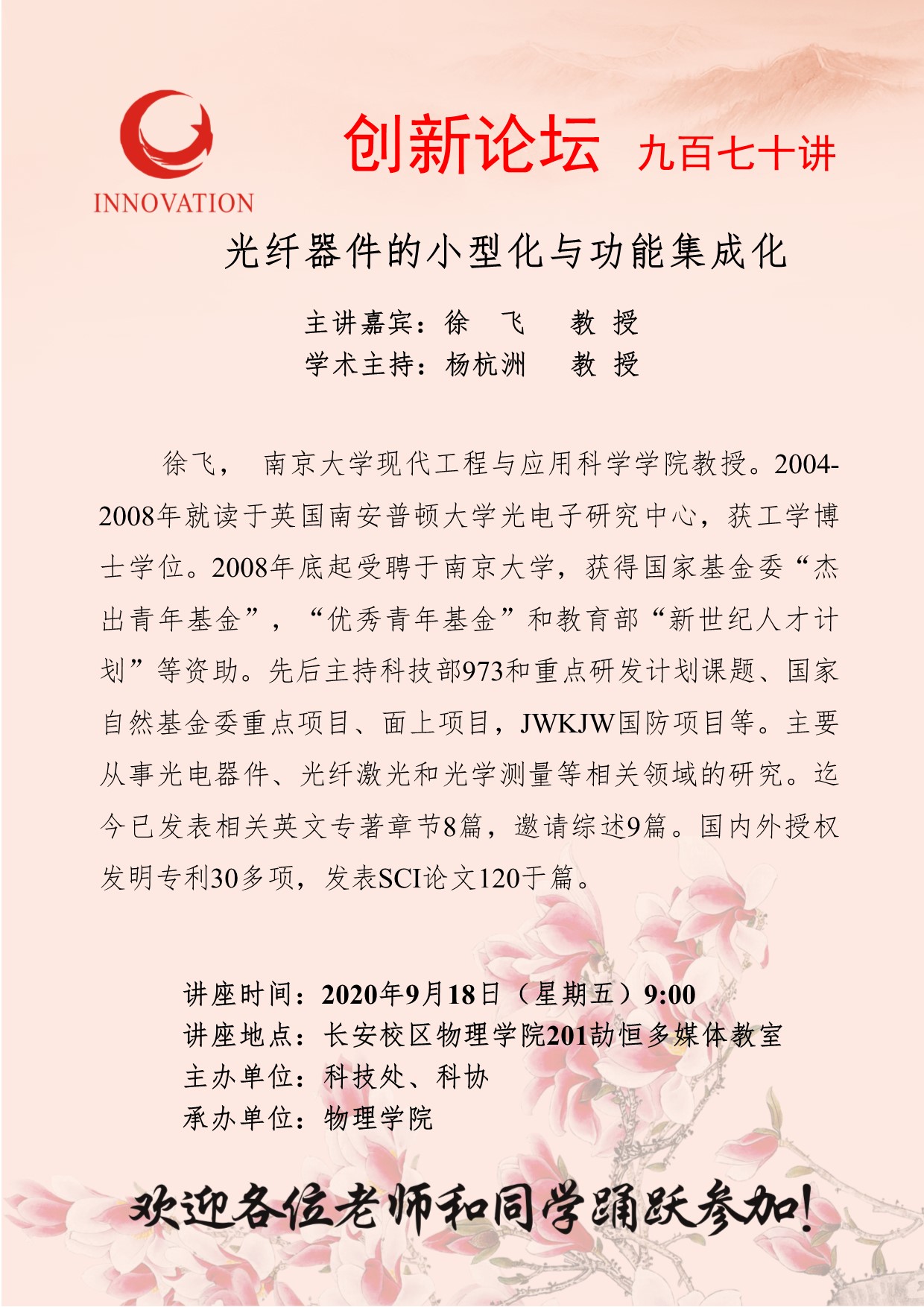 徐飞 教 授 赢博官方(中国)总部创新论坛第九百七十讲:光纤器件的小型化与功能集成化 讲座时间 2020年9月18日(星期五)9:00 讲座地点 长安校区物理学院201劼恒多媒体教室 讲座人介绍 徐飞 教 授 讲座内容