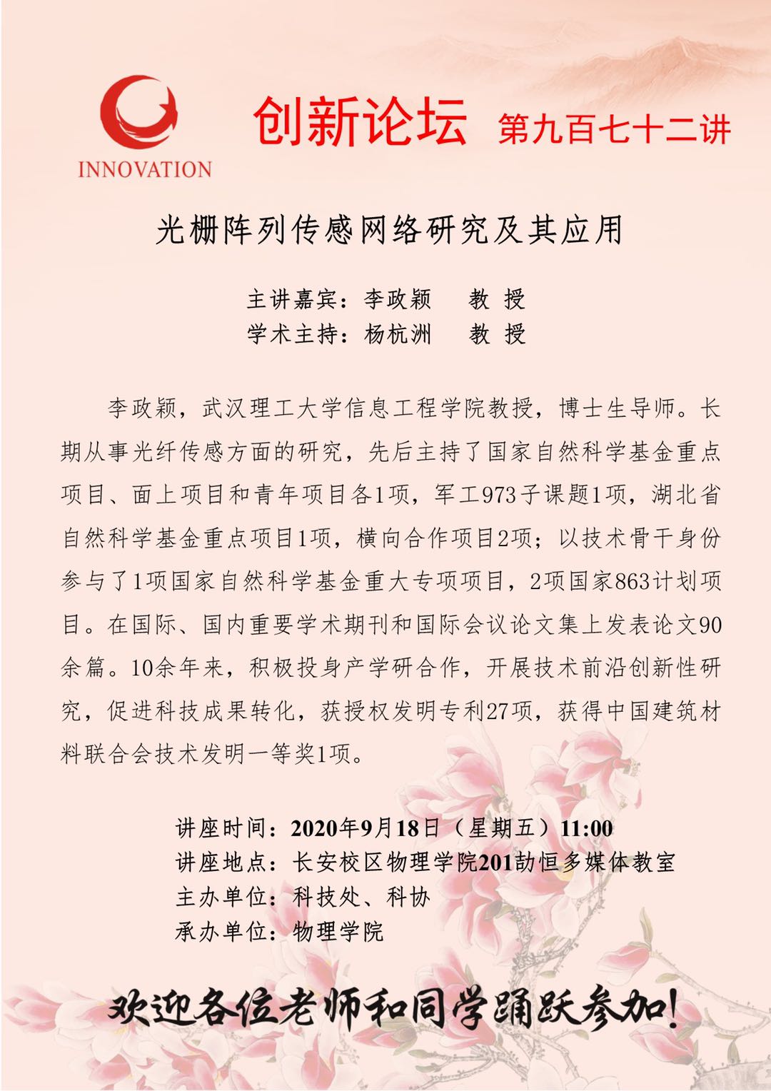 李政颖 教授 赢博官方(中国)总部创新论坛第九百七十二讲:光栅阵列传感网络研究及其应用 讲座时间 2020年9月18日(星期五)11:00 讲座地点 长安校区物理学院201劼恒多媒体教室 讲座人介绍 李政颖 教授 讲座内容