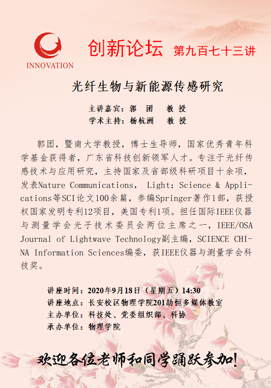 郭团 教授 赢博官方(中国)总部创新论坛第九百七十三讲:光纤生物与新能源传感研究 讲座时间 2020年9月18日(星期五)14:30 讲座地点 长安校区物理学院201劼恒多媒体教室 讲座人介绍 郭团 教授 讲座内容