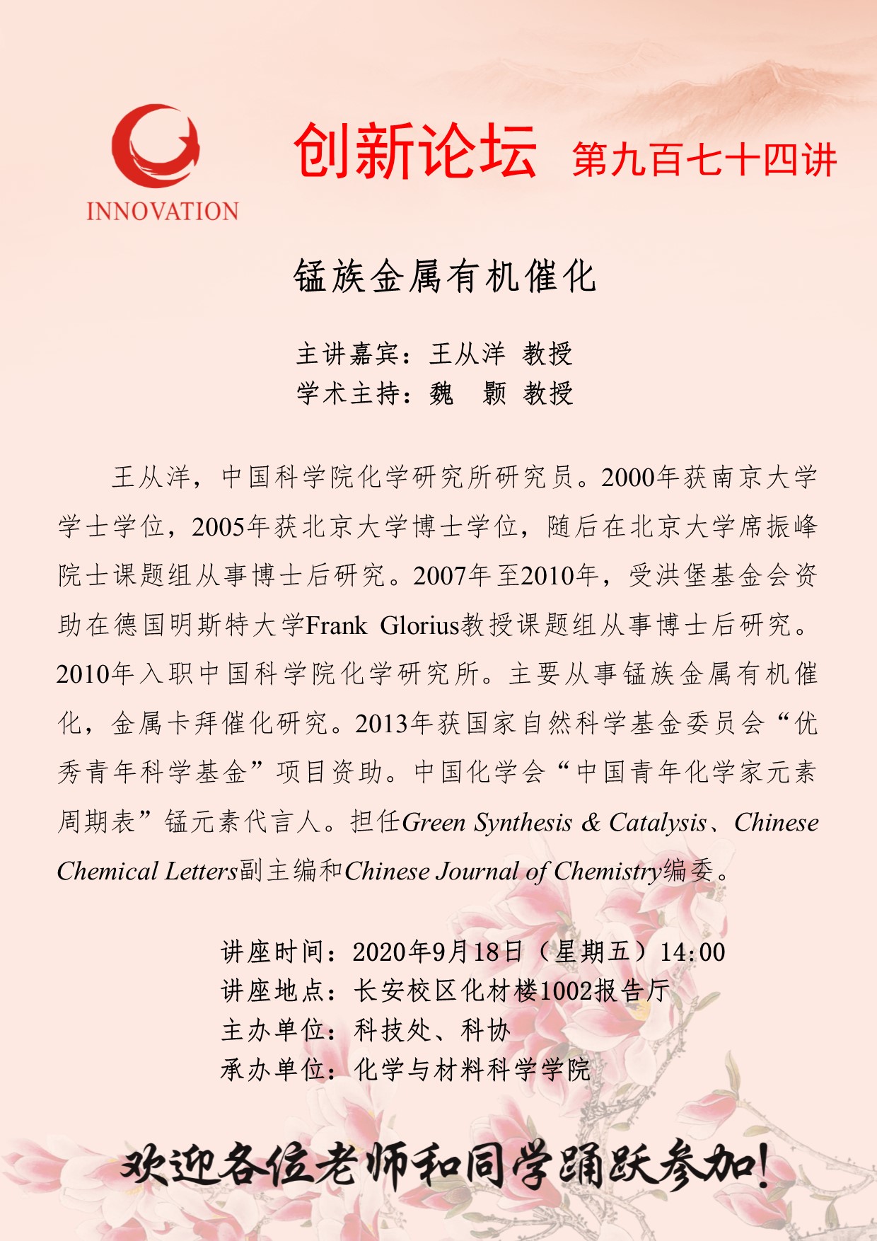 王从洋 教授 赢博官方(中国)总部创新论坛第九百七十四讲:锰族金属有机催化 讲座时间 2020年9月18日(星期五)14:00 讲座地点 长安校区化材学院1002报告厅 讲座人介绍 王从洋 教授 讲座内容