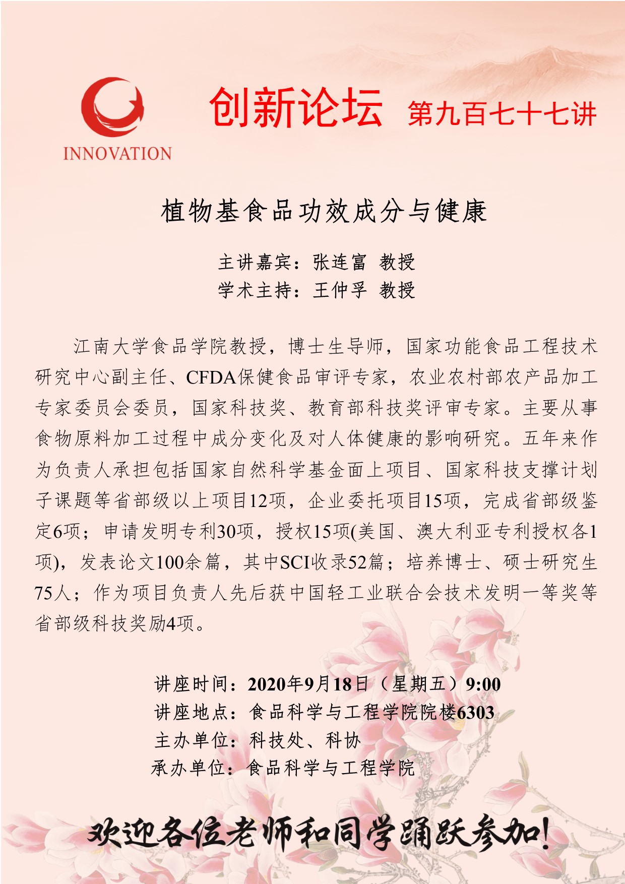 张连富 教授 赢博官方(中国)总部创新论坛第九百七十七讲:植物基食品功效成分与健康 讲座时间 2020年9月18日(星期五)9:00 讲座地点 食品科学与工程学院院楼6303 讲座人介绍 张连富 教授 讲座内容