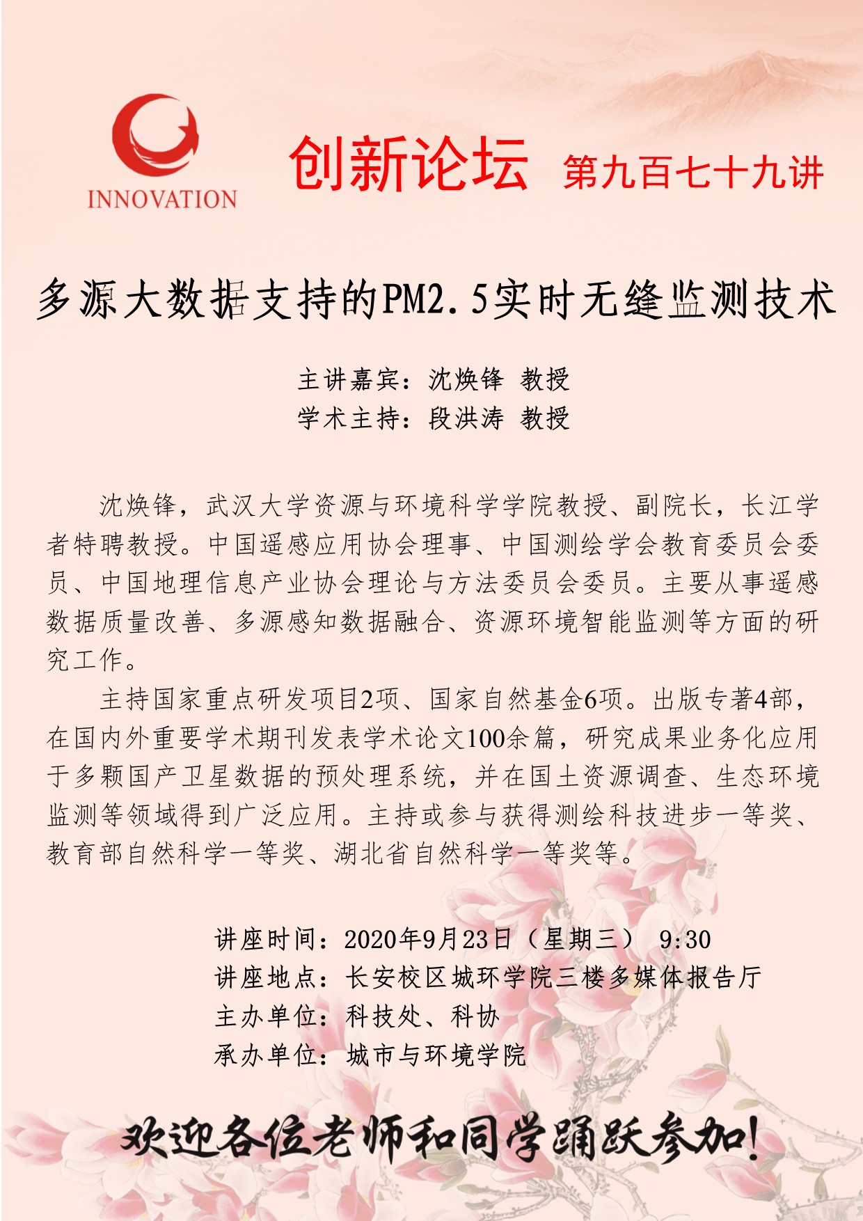 沈焕锋 教授 赢博官方(中国)总部创新论坛第九百七十九讲:多源大数据支持的PM2.5实时无缝监测技术 讲座时间 2020年9月23日(星期三) 9:30 讲座地点 长安校区城环学院三楼多媒体报告厅 讲座人介绍 沈焕锋 教授 讲座内容