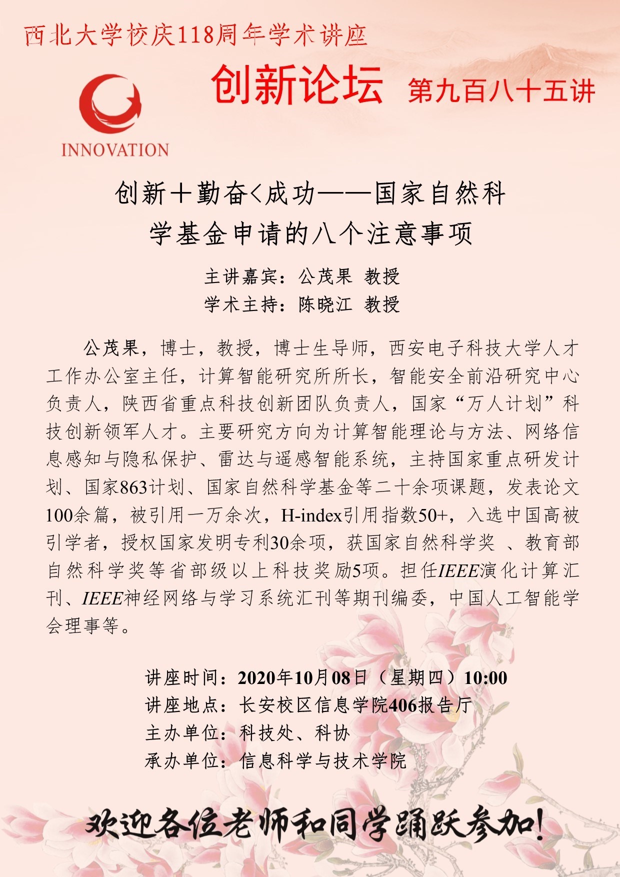 公茂果教授 赢博官方(中国)总部创新论坛第九百八十五讲暨校庆118周年学术讲座:创新+勤奋<成功——国家自然科学基金申请的八个注意事项 讲座时间 2020年10月8日(星期四)10:00 讲座地点 长安校区信息学院406报告厅 讲座人介绍 公茂果教授 讲座内容