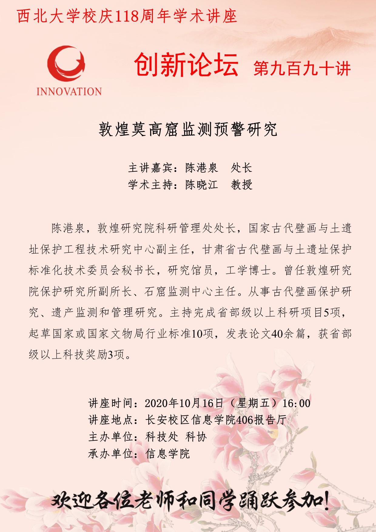 陈港泉 处长 赢博官方(中国)总部创新论坛第九百九十讲暨校庆118周年学术讲座:敦煌莫高窟监测预警研究 讲座时间 2020年10月16日(星期五)16:00 讲座地点 长安校区信息学院406报告厅 讲座人介绍 陈港泉 处长 讲座内容
