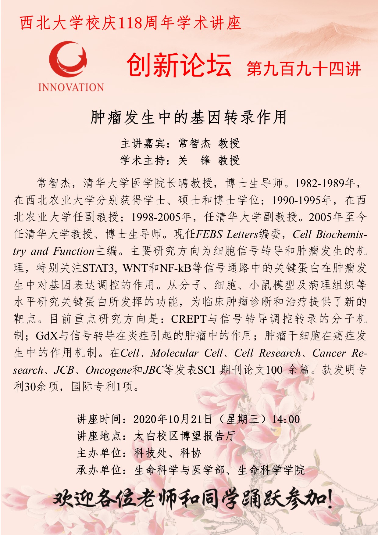 常智杰 教授 赢博官方(中国)总部创新论坛第九百九十四讲暨校庆118周年学术讲座:肿瘤发生中的基因转录作用 讲座时间 2020年10月21日(星期三)14:00 讲座地点 太白校区博望报告厅 讲座人介绍 常智杰 教授 讲座内容