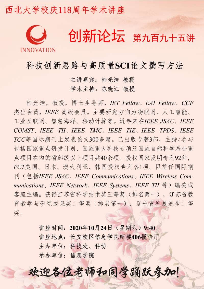 韩光洁 教授 赢博官方(中国)总部创新论坛第九百九十五讲暨校庆118周年学术讲座:科技创新思路与高质量SCI论文撰写方法 讲座时间 2020年10月24日(星期六)9:40 讲座地点 长安校区信息学院新楼406报告厅 讲座人介绍 韩光洁 教授 讲座内容