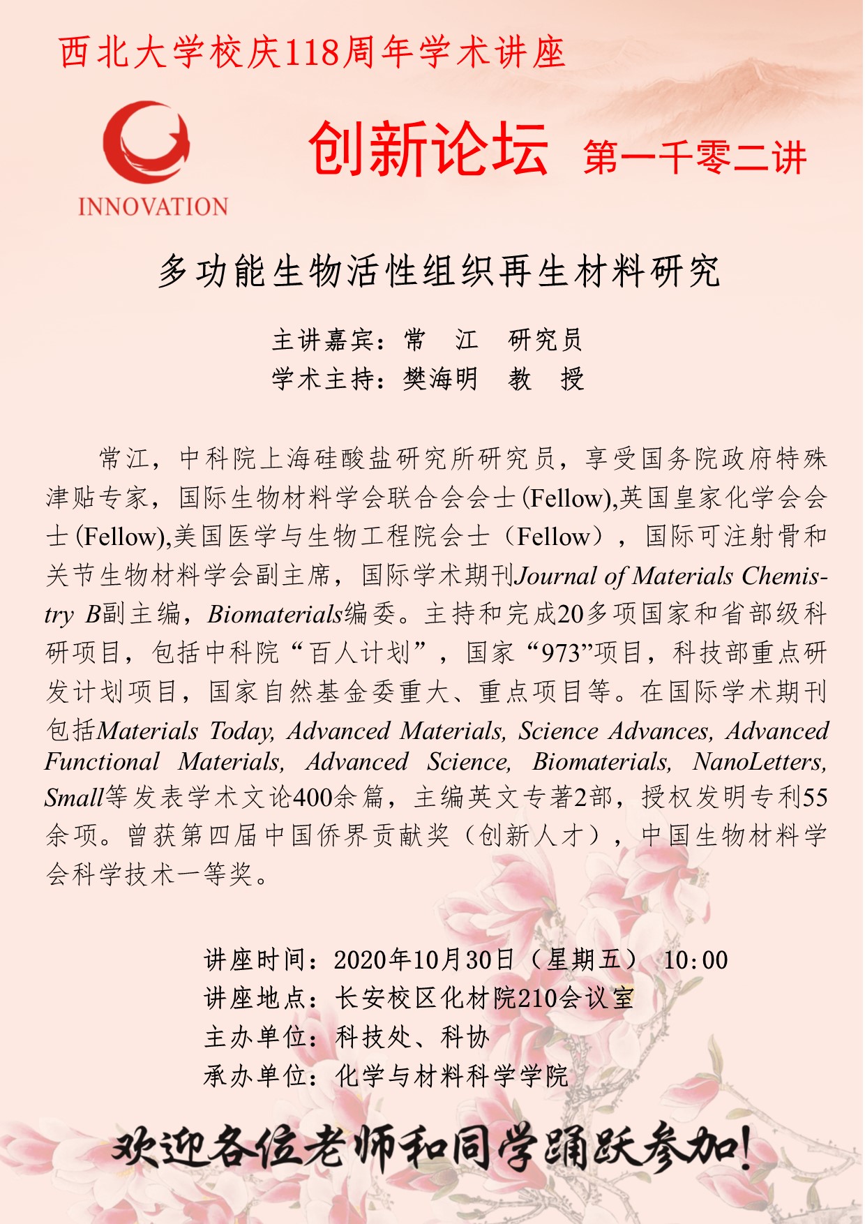 常江 研究员 赢博官方(中国)总部创新论坛第一千零二讲暨校庆118周年学术讲座:多功能生物活性组织再生材料研究 讲座时间 2020年10月30日(星期五)10:00 讲座地点 化学与材料科学学院210室 讲座人介绍 常江 研究员 讲座内容