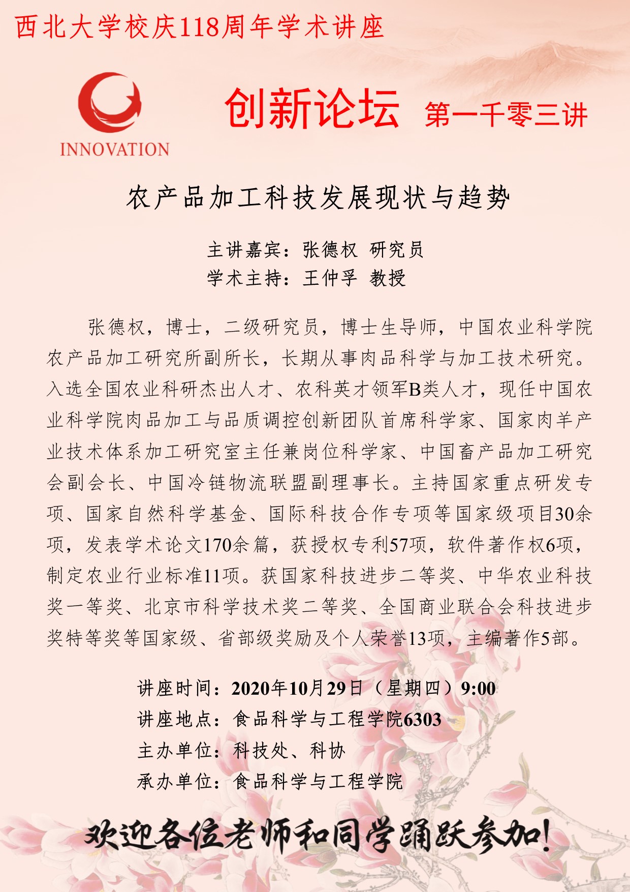 张德权 研究员 赢博官方(中国)总部创新论坛第一千零三讲暨校庆118周年学术讲座:农产品加工科技发展现状与趋势 讲座时间 2020年10月29日(星期四)9:00 讲座地点 食品科学与工程学院6303 讲座人介绍 张德权 研究员 讲座内容
