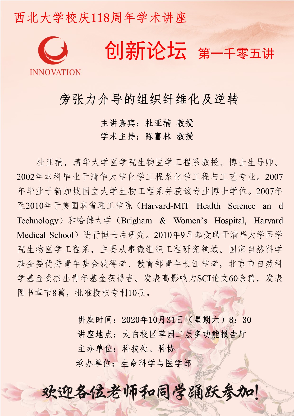 杜亚楠 教授 赢博官方(中国)总部创新论坛第一千零五讲暨校庆118周年学术讲座:旁张力介导的组织纤维化及逆转 讲座时间 2020年10月31日(星期六)8:30 讲座地点 太白校区萃园二层多功能报告厅 讲座人介绍 杜亚楠 教授 讲座内容