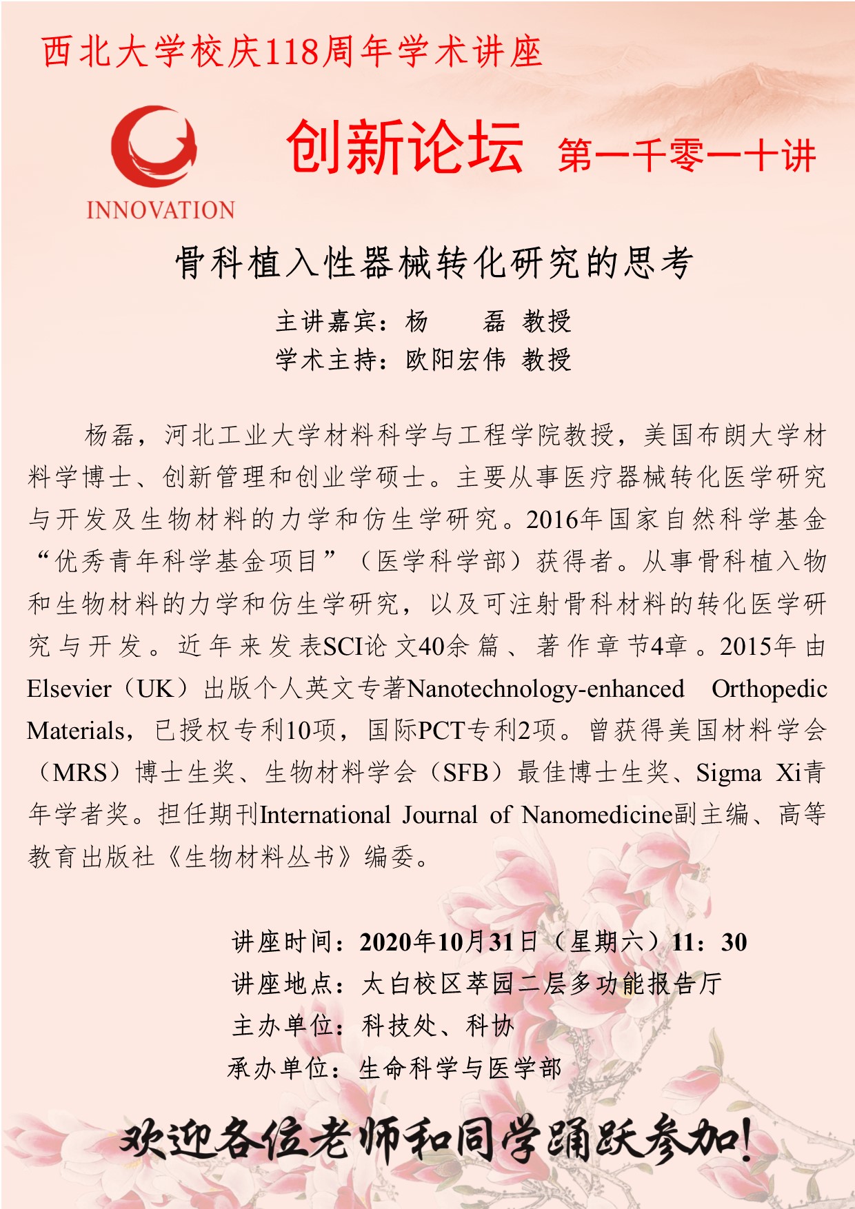 杨磊 教授 赢博官方(中国)总部创新论坛第一千零一十讲暨校庆118周年学术讲座:骨科植入性器械转化研究的思考 讲座时间 2020年10月31日(星期六)11:30 讲座地点 太白校区萃园二层多功能报告厅 讲座人介绍 杨磊 教授 讲座内容