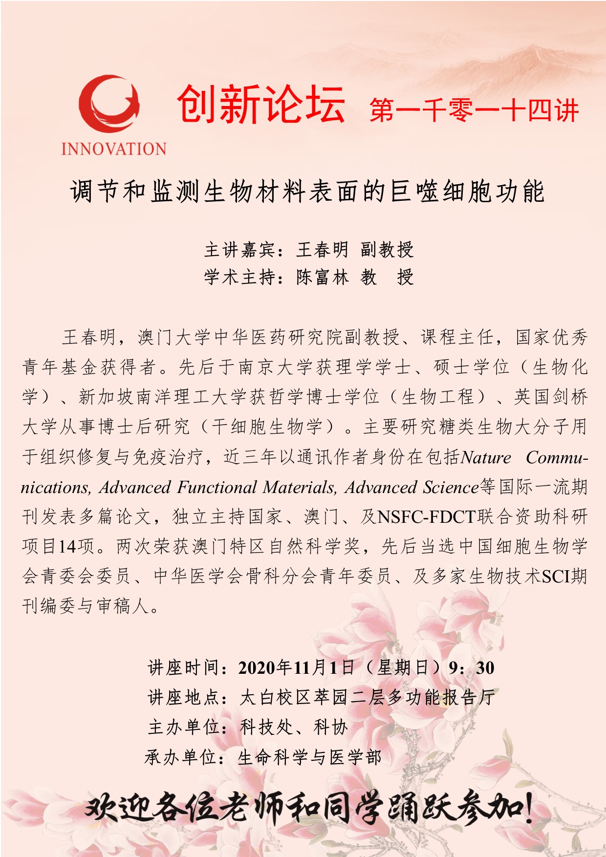 王春明 副教授 赢博官方(中国)总部创新论坛第一千零一十四讲:调节和监测生物材料表面的巨噬细胞功能 讲座时间 2020年11月1日(星期日)9:30 讲座地点 太白校区萃园二层多功能报告厅 讲座人介绍 王春明 副教授 讲座内容
