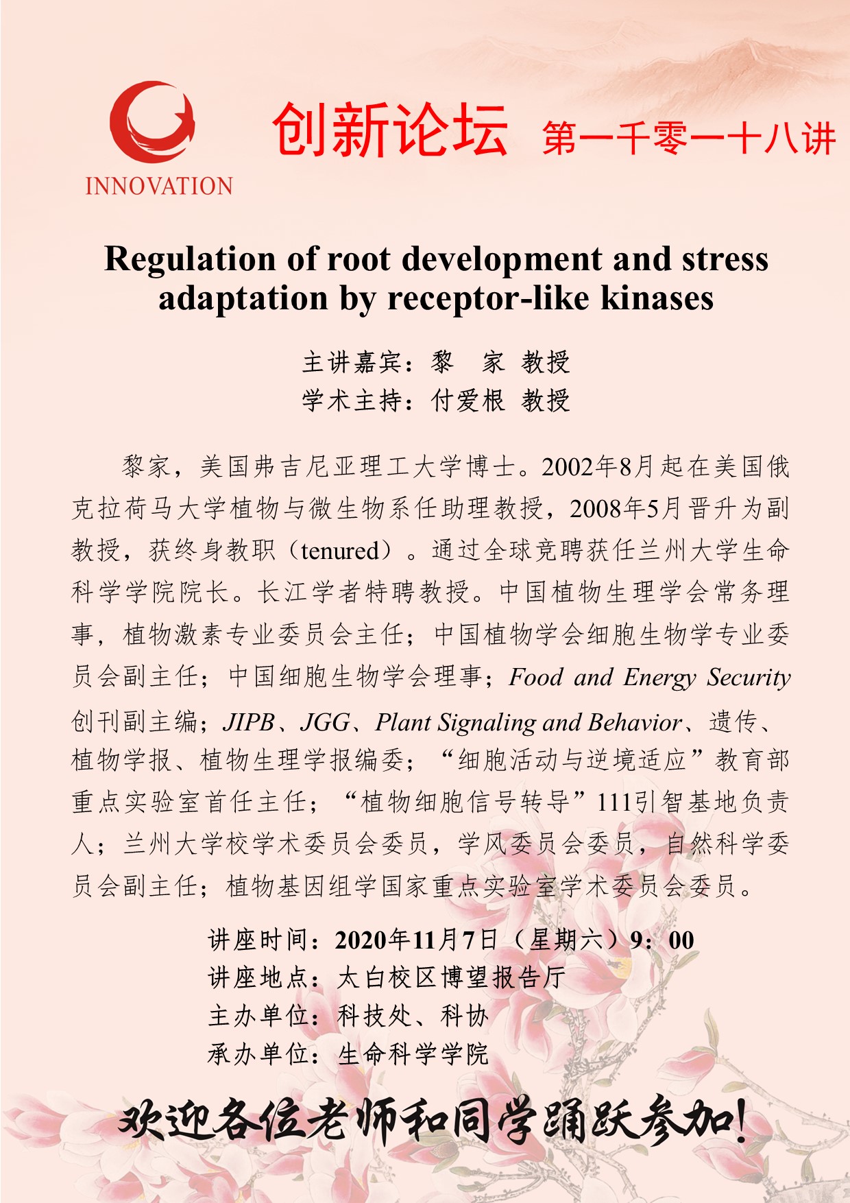黎 家 教授 赢博官方(中国)总部创新论坛第一千零一十八讲:Regulation of root development and stress adaptation by receptor-like kinases 讲座时间 2020年11月7日(星期六)9:00 讲座地点 太白校区博望报告厅 讲座人介绍 黎 家 教授 讲座内容