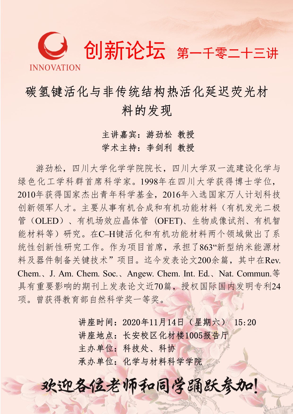 游劲松 教授 赢博官方(中国)总部创新论坛第一千零二十三讲:碳氢键活化与非传统结构热活化延迟荧光材料的发现 讲座时间 2020年 11月14日(周六)15:20 讲座地点 长安校区化材楼1005报告厅 讲座人介绍 游劲松 教授 讲座内容