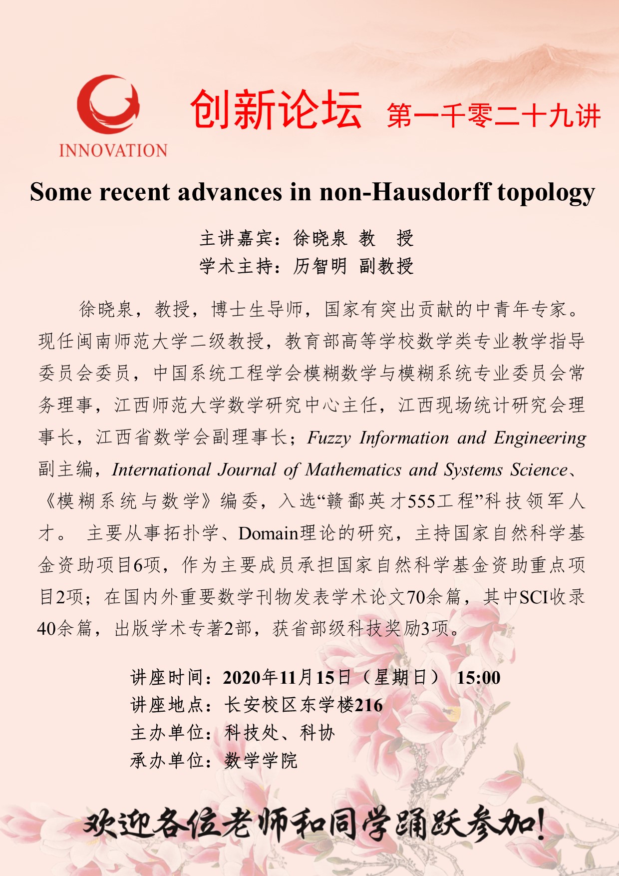 徐晓泉 教授 赢博官方(中国)总部创新论坛第一千零二十九讲:Some recent advances in non-Hausdorff topology 讲座时间 2020年11月15日(星期日) 15:00 讲座地点 长安校区东学楼216 讲座人介绍 徐晓泉 教授 讲座内容