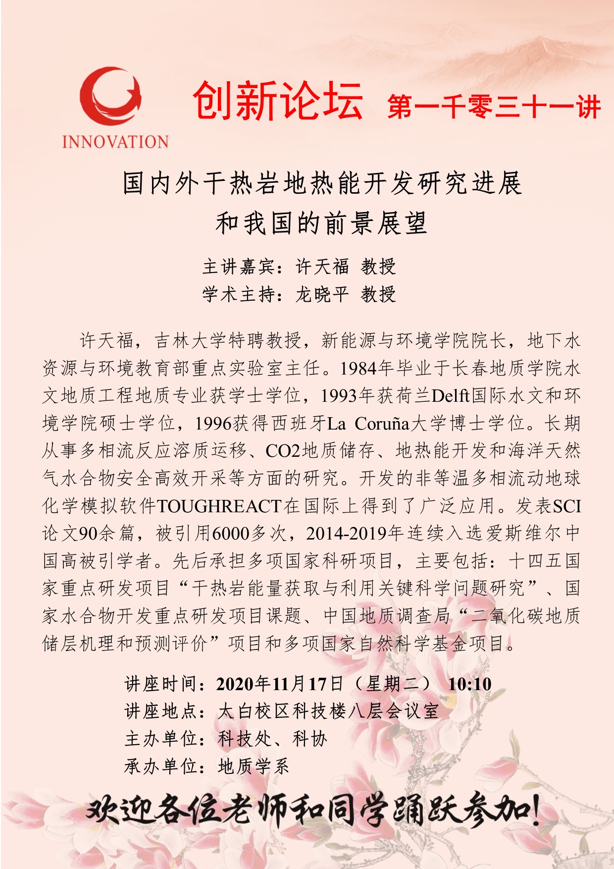 许天福 教授 赢博官方(中国)总部创新论坛第一千零三十一讲:国内外干热岩地热能开发研究进展和我国的前景展望 讲座时间 2020年11月17日(星期二) 10:10 讲座地点 太白校区科技楼八层会议室 讲座人介绍 许天福 教授 讲座内容