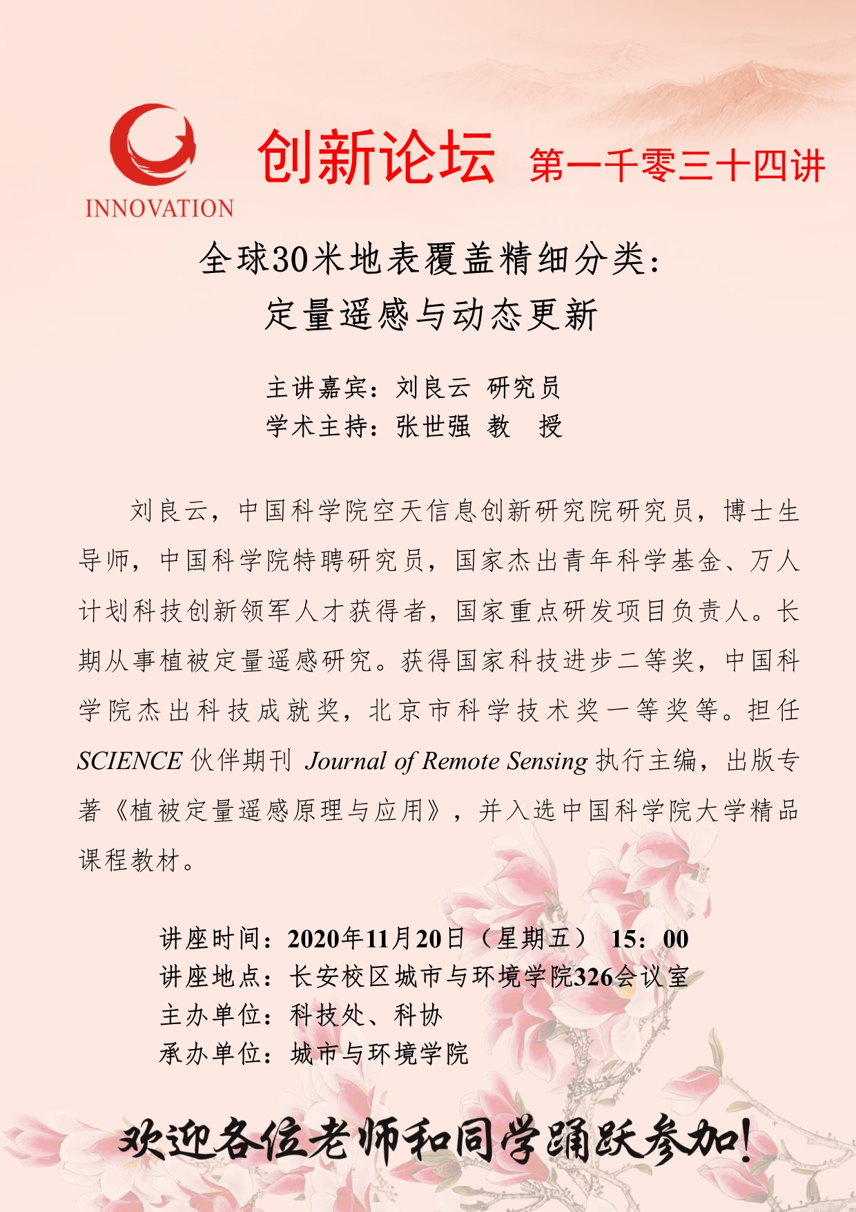 刘良云 研究员 赢博官方(中国)总部创新论坛第一千零三十四讲:全球30米地表覆盖精细分类:定量遥感与动态更新 讲座时间 2020年11月20日(星期五) 15:00 讲座地点 长安校区城市与环境学院326会议室 讲座人介绍 刘良云 研究员 讲座内容