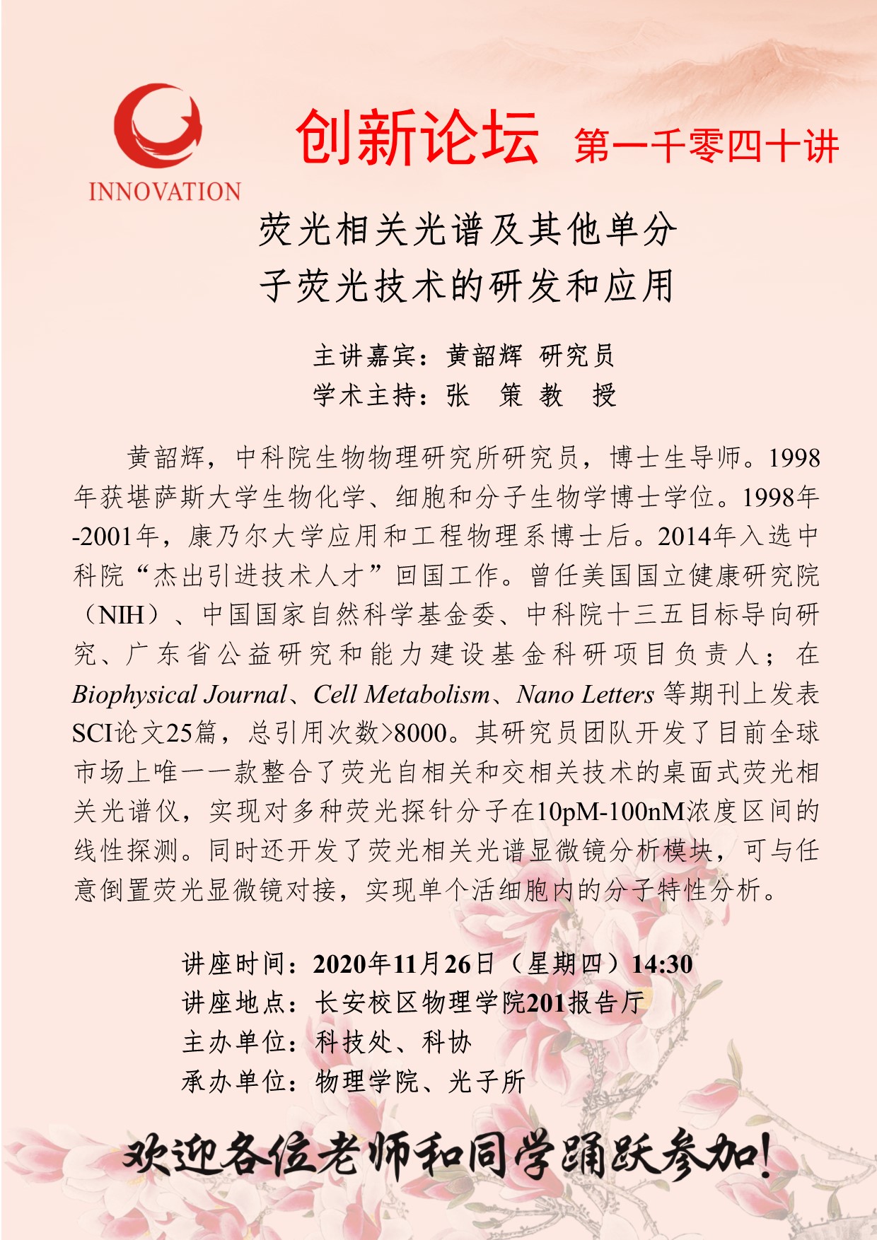黄韶辉 研究员 赢博官方(中国)总部创新论坛第一千零四十讲:荧光相关光谱及其他单分子荧光技术的研发和应用 讲座时间 2020年11月26日(星期四)14:30 讲座地点 长安校区物理学院201报告厅 讲座人介绍 黄韶辉 研究员 讲座内容