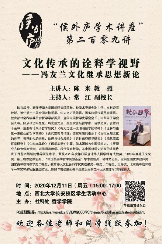 陈 来 教 授 侯外庐学术讲座第二百零九讲:文化传承的诠释学视野——冯友兰文化继承思想新论 讲座时间 2020年12月11日(周五)15:00-17:00 讲座地点 赢博官方(中国)总部长安校区学生活动中心 讲座人介绍 陈 来 教 授 讲座内容