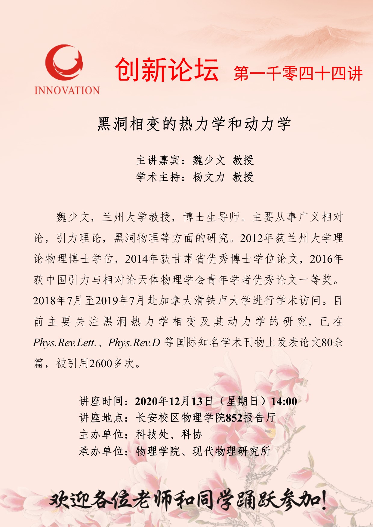 魏少文 教授 赢博官方(中国)总部创新论坛第一千零四十四讲:黑洞相变的热力学和动力学 讲座时间 2020年12月13日(星期日)14:00 讲座地点 长安校区物理学院852报告厅 讲座人介绍 魏少文 教授 讲座内容