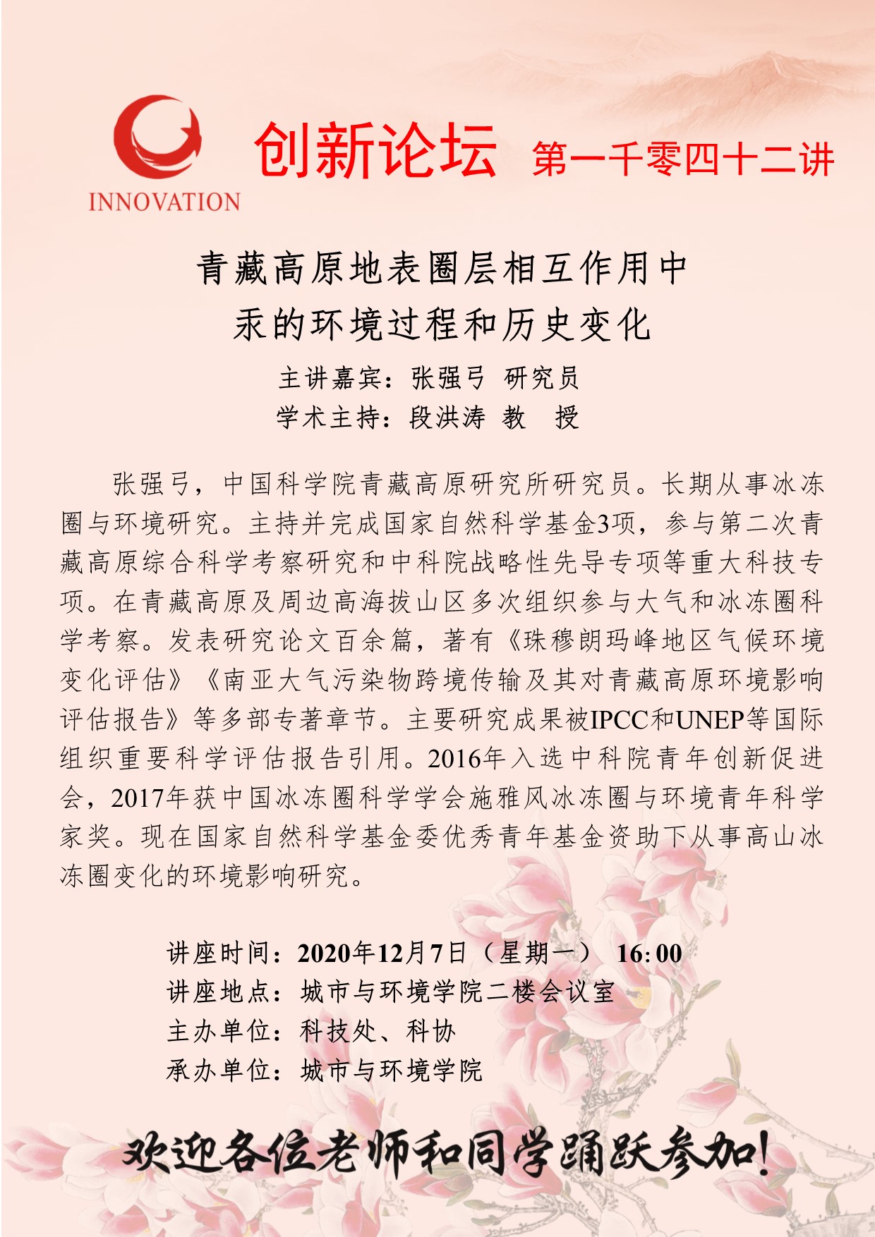 张强弓 研究员 赢博官方(中国)总部创新论坛第一千零四十二讲:青藏高原地表圈层相互作用中汞的环境过程和历史变化 讲座时间 2020年12月7日(星期一) 16:00 讲座地点 城市与环境学院二楼会议室 讲座人介绍 张强弓 研究员 讲座内容