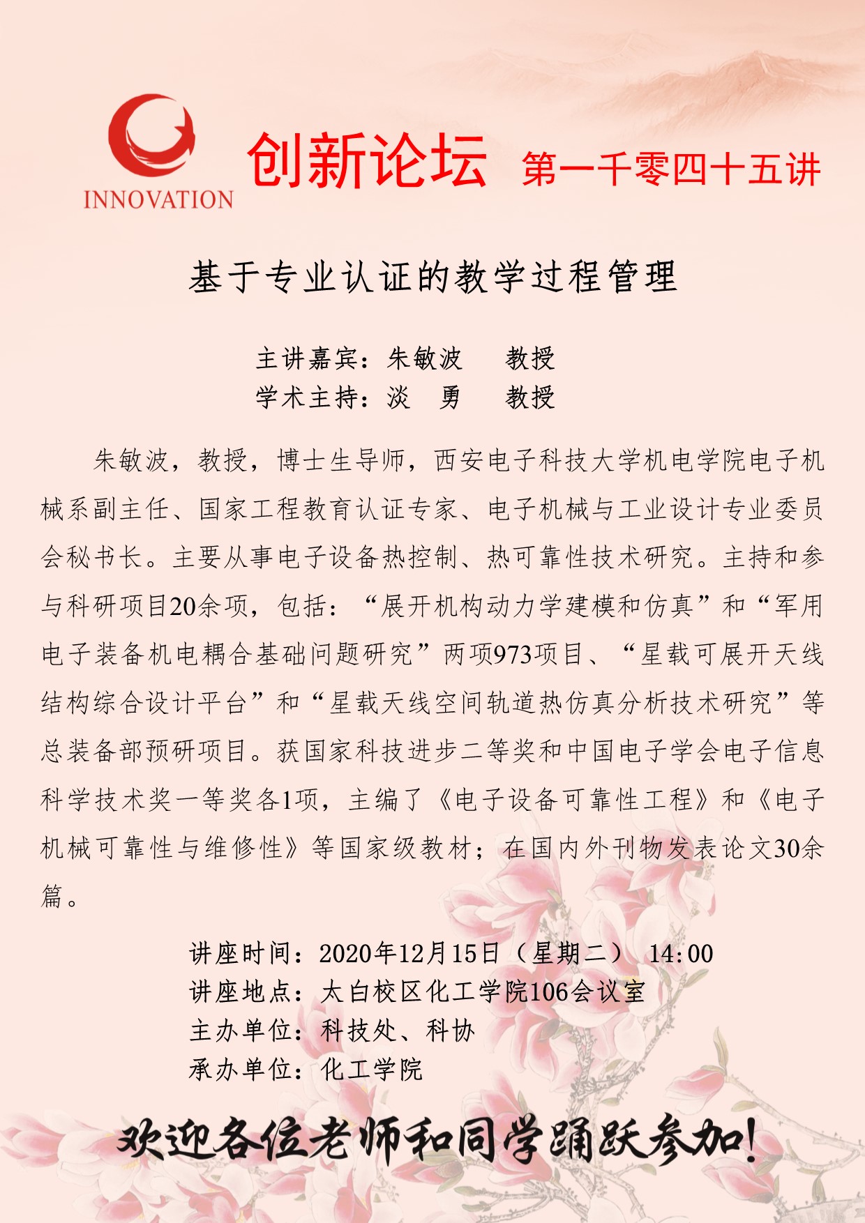 朱敏波 教授 赢博官方(中国)总部创新论坛第一千零四十五讲:基于专业认证的教学过程管理 讲座时间 2020年12月15日(星期二) 14:00 讲座地点 太白校区化工学院106会议室 讲座人介绍 朱敏波 教授 讲座内容