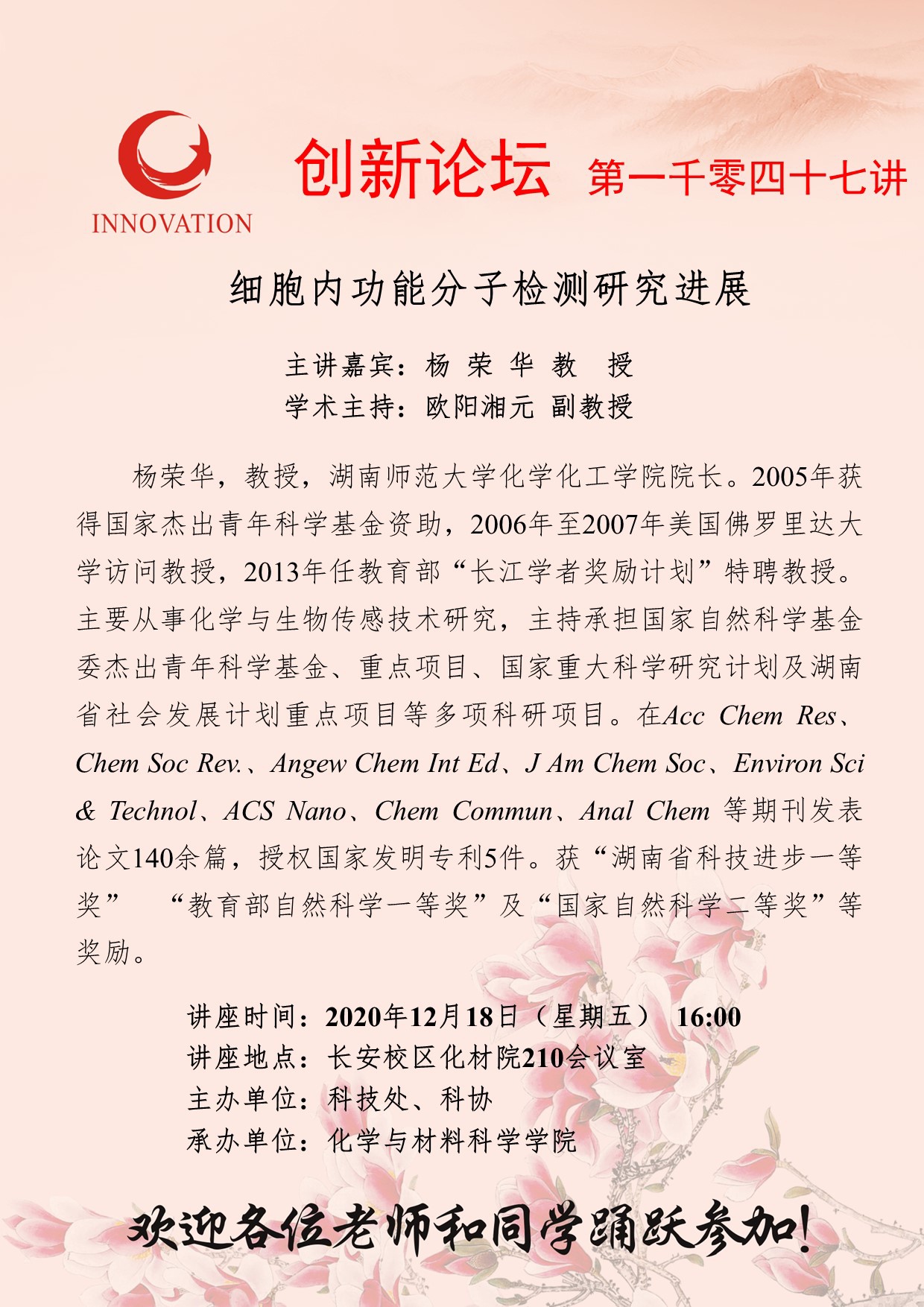杨荣华 教授 赢博官方(中国)总部创新论坛第一千零四十七讲:细胞内功能分子检测研究进展 讲座时间 2020年12月18日(星期五) 16:00 讲座地点 长安校区化材院210会议室 讲座人介绍 杨荣华 教授 讲座内容