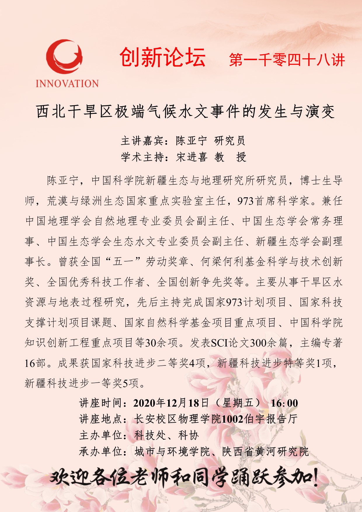 陈亚宁 研究员 赢博官方(中国)总部创新论坛第一千零四十八讲:西北干旱区极端气候水文事件的发生与演变研究 讲座时间 2020年12月18日(星期五)16:00 讲座地点 长安校区物理楼伯宇报告厅 讲座人介绍 陈亚宁 研究员 讲座内容