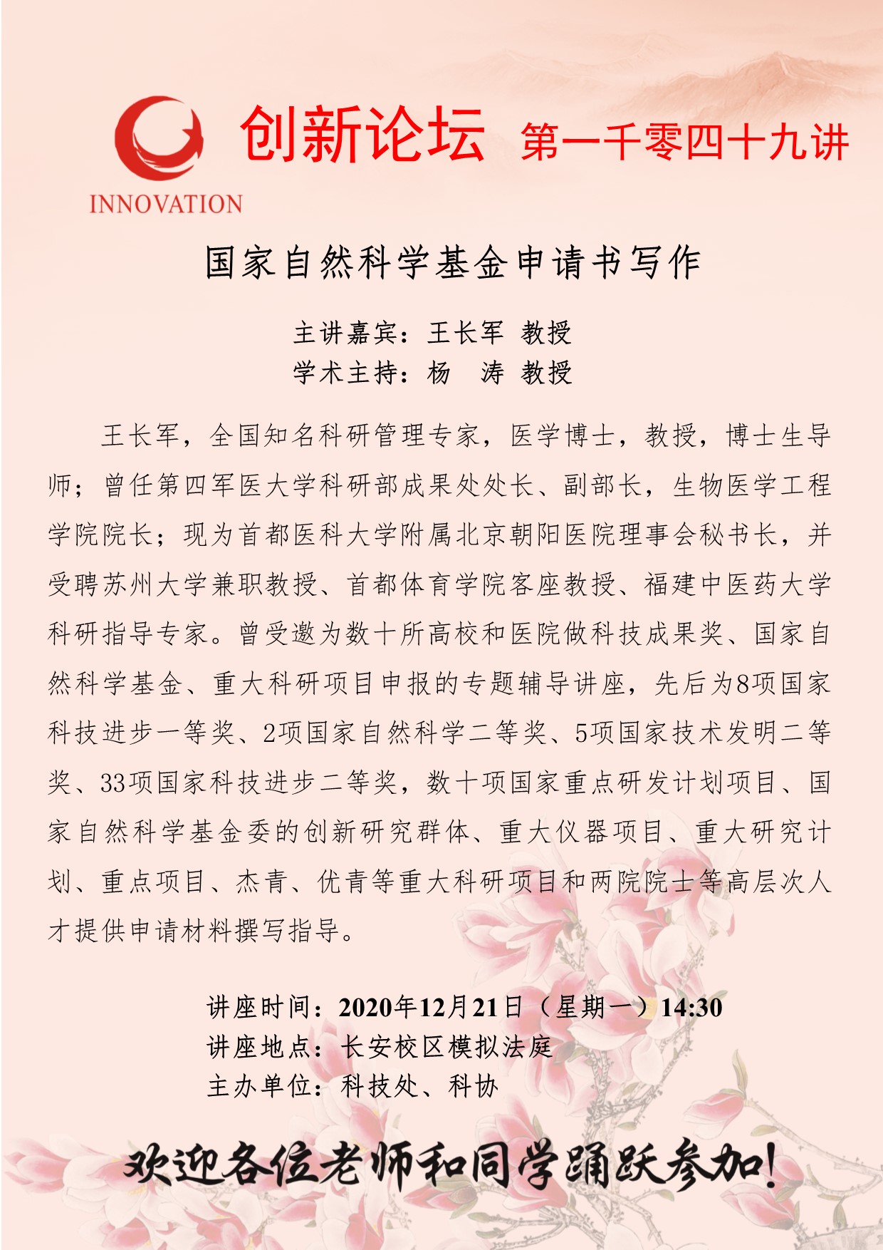 王长军 教授 赢博官方(中国)总部创新论坛第一千零四十九讲:国家自然科学基金申请书写作 讲座时间 2020年12月21日(星期一)14:30 讲座地点 长安校区模拟法庭 讲座人介绍 王长军 教授 讲座内容
