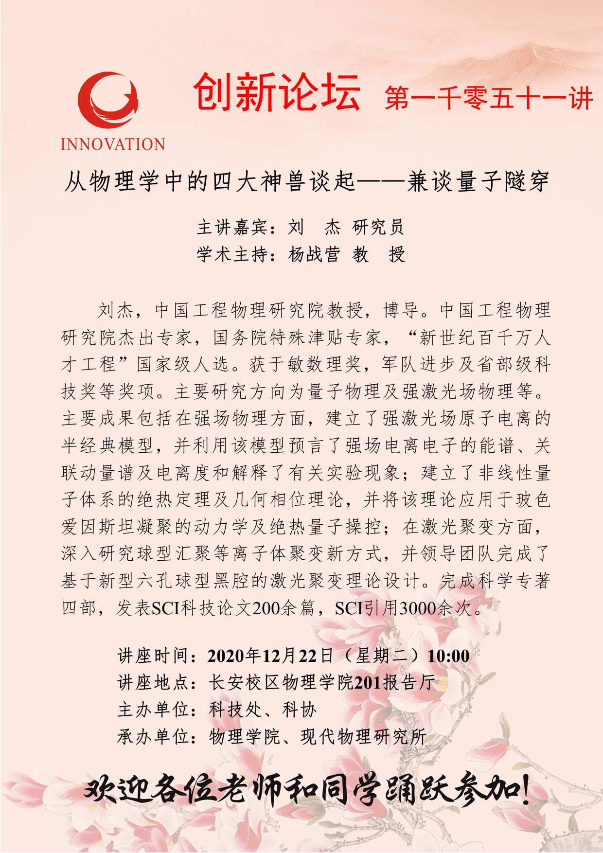 刘 杰 研究员 赢博官方(中国)总部创新论坛第一千零五十一讲:从物理学中的四大神兽谈起——兼谈量子隧穿 讲座时间 2020年12月22日(星期二)10:00 讲座地点 长安校区物理学院201报告厅 讲座人介绍 刘 杰 研究员 讲座内容