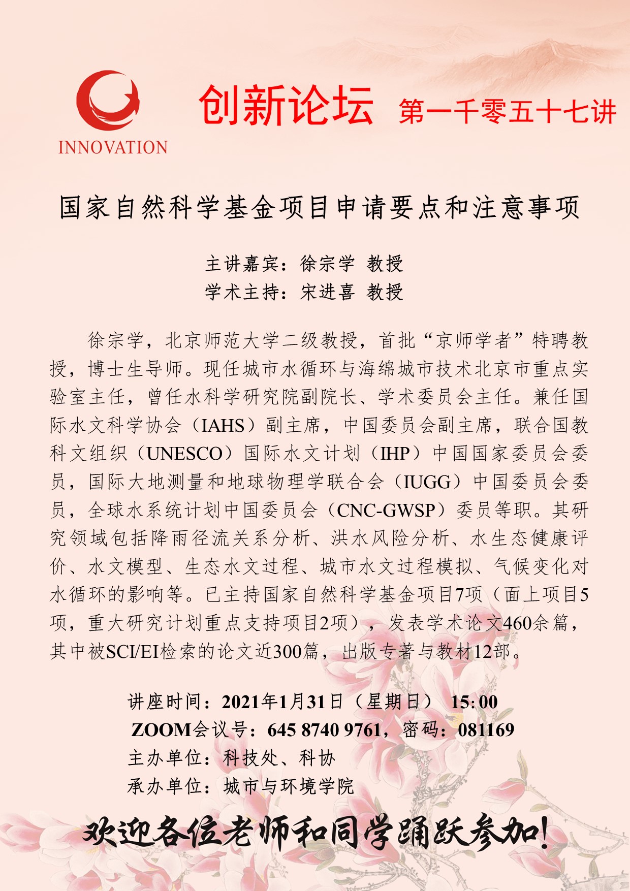徐宗学 教授 赢博官方(中国)总部创新论坛第一千零五十七讲:国家自然科学基金项目申请要点和注意事项 讲座时间 2021年1月31日(星期日) 15:00 讲座地点 ZOOM会议号:64587409761,密码:081169 讲座人介绍 徐宗学 教授 讲座内容